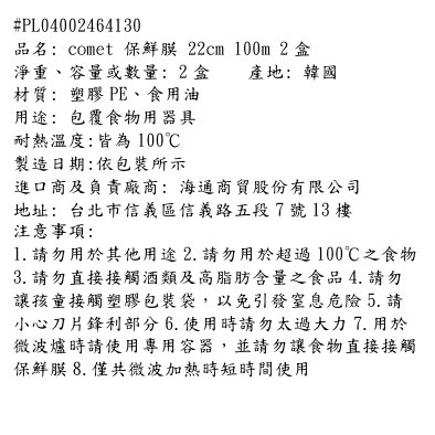 這款comet保鮮膜是您廚房的理想選擇,讓您輕鬆保存食物,保持新鮮美味。每盒保鮮膜尺寸為22公分寬,長度達100公尺,一組包含兩盒,經濟實惠,持久耐用。採用安全的塑料PE材質製成,不含BPA,讓您安心使用。保鮮膜具有良好的延展性和黏性,能緊密貼合各種形狀的容器。無論是保存剩菜、水果還是肉類,comet保鮮膜都能為您提供可靠的保護,讓您的食物保持最佳狀態。