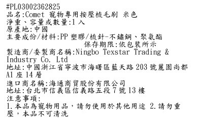 這款Comet寵物專用按壓梳毛刷,採用人性化按壓設計,讓您輕鬆為愛寵梳理毛髮,告別毛髮打結的煩惱。圓頭梳齒溫和按摩寵物肌膚,促進血液循環,增進您與寵物間的親密互動。產品選用PP塑膠與不鏽鋼材質,堅固耐用且易於清潔,確保寵物梳毛刷的長期使用與衛生。米色外觀簡約時尚,為您的寵物護理增添一份色彩。使用時請注意,本產品為寵物用品,請勿使用於其他用途,並避免重壓。