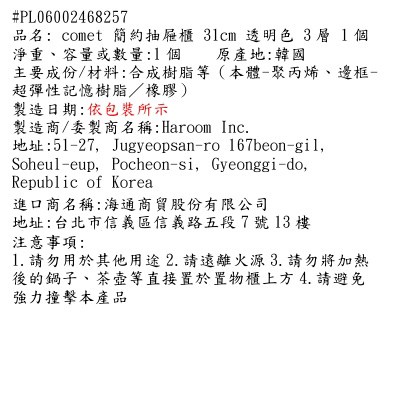 這款comet簡約抽屜櫃,採用透明色系與簡約設計,輕鬆融入各種居家風格。三層抽屜提供充足的收納空間,讓您輕鬆整理各式物品,告別雜亂。31公分的寬度設計,即使是小坪數空間也能輕鬆擺放,不佔空間。透明抽屜設計,讓您一目瞭然,快速找到所需物品,提升生活效率。無論是臥室、客廳或書房,都能輕鬆使用,是您居家收納的好幫手。
