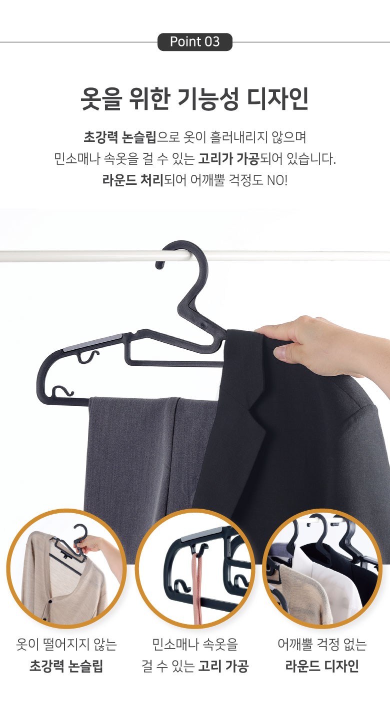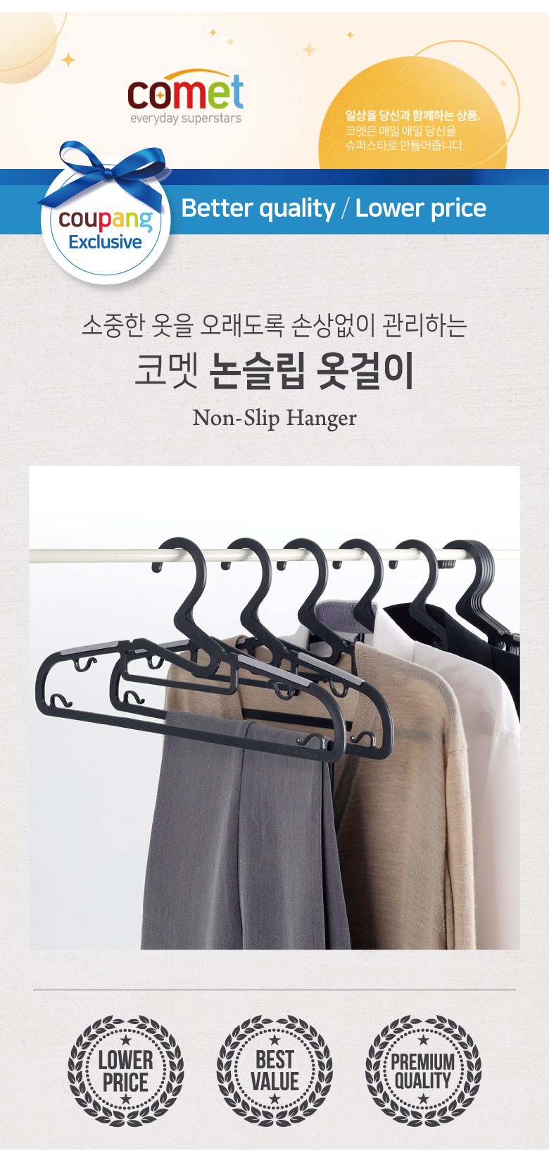 Comet防滑衣架採用簡約纖薄設計,能有效節省衣櫃空間,讓收納更有效率。其超強防滑功能,能保護衣物不易滑落,避免變形或產生摺痕。灰色系的簡約風格,輕鬆搭配各式衣櫃,提升居家美感。韓國製造的優良品質,讓您長久使用,保護珍貴衣物不受損傷。無論是襯衫、上衣或無袖衣物,都能輕鬆掛起,是您整理衣物的最佳選擇。現在就使用Comet防滑衣架,讓衣櫃煥然一新!
