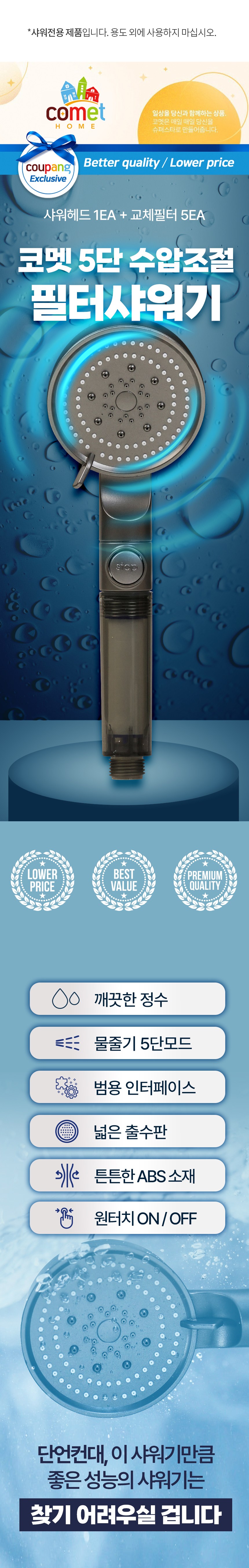 Comet五段水壓調節濾芯蓮蓬頭,為您帶來全新的淋浴體驗。這款蓮蓬頭具備五種不同的水壓模式,可根據您的喜好和需求隨意調整,無論是輕柔的噴霧還是強勁的按摩,都能輕鬆實現。內置濾芯有效過濾水中的雜質,讓您享受更乾淨、更健康的水源。一鍵式開關設計,操作簡單方便,節水又環保。堅固的ABS材質,耐用不易損壞,是您浴室的理想選擇。