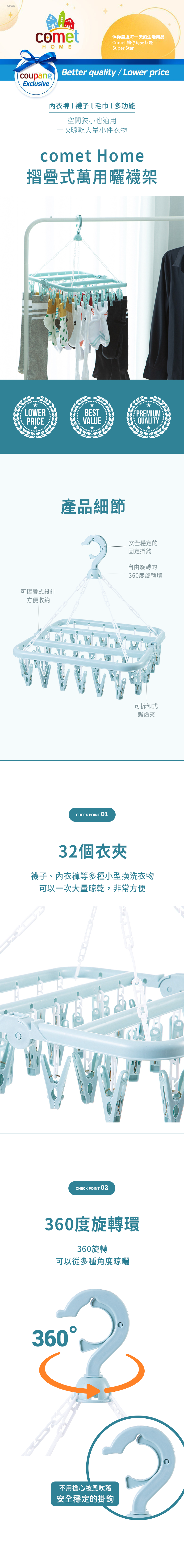 - 360度旋轉掛鉤,曬衣無死角,享受全方位陽光,快速乾燥。