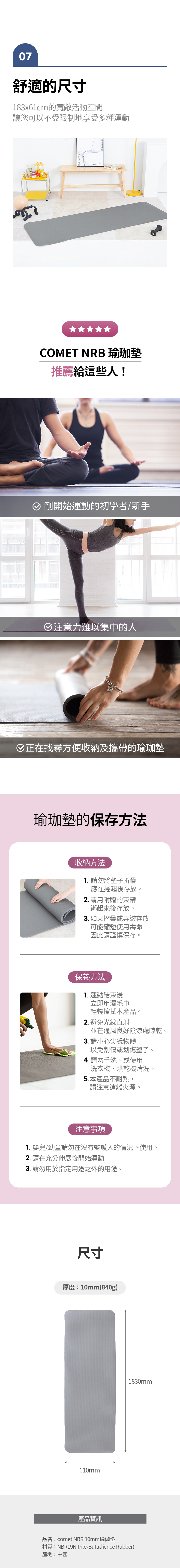 這款comet NBR材質瑜珈墊,採用高品質NBR橡膠製成,提供卓越的舒適度和支撐力。10mm加厚設計能有效緩衝運動時的衝擊,保護您的關節,讓您在瑜珈或皮拉提斯練習中更加安心。防滑表面處理,增加運動時的穩定性,避免滑動,讓您更專注於動作。灰色簡約設計,適合各種運動風格。附贈繩帶/收納包,方便攜帶和收納,隨時隨地享受運動的樂趣。尺寸為183cm*61cm,提供足夠的運動空間。