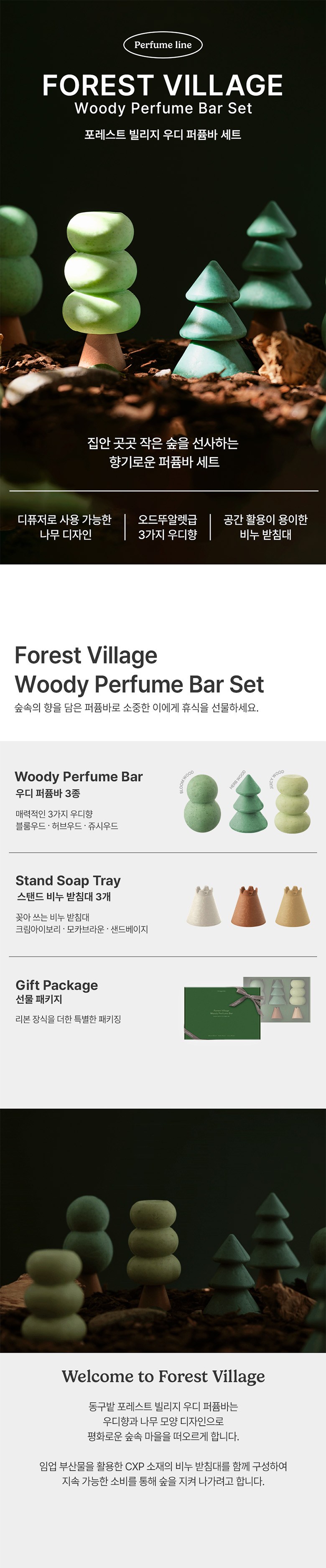 Donggubat森林村莊木質香氛皂套裝,為您帶來小森林的芬芳。此套裝包含三款迷人的木質香調:花木香、草本木香和果汁木香,讓您在家中也能體驗到大自然的清新。獨特的樹木造型設計,不僅是香氛皂,更可作為擴香使用,為空間增添藝術氣息。搭配CXP材質的肥皂架,體現可持續消費的理念,守護森林。淡香水等級的香料比例,讓您在沐浴時享受持久且深度的香氣。