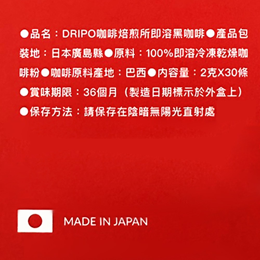 DRIPO即溶黑咖啡,採用冷凍乾燥技術,完整保留咖啡的原始風味,讓您隨時隨地都能享受一杯香醇濃郁的黑咖啡。深度烘焙帶來更豐富的口感層次,每一口都充滿驚喜。獨立包裝方便攜帶,無論是在辦公室、家中或旅途中,都能輕鬆沖泡。每盒30入,滿足您長時間的咖啡需求,是您快速享受美味咖啡的最佳選擇。