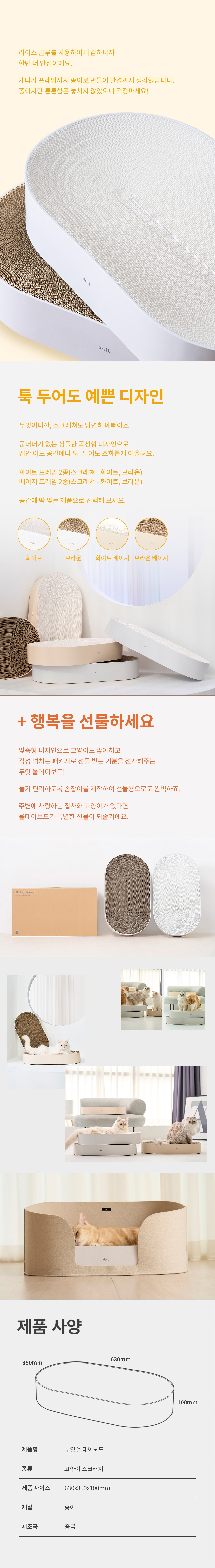 duit Do It Cat 全天板抓板是一款專為貓咪設計的舒適抓板。圓弧曲線設計能溫柔包覆貓咪的身體,提供安全感,橫向加寬的尺寸讓貓咪可以盡情伸展,各種睡姿都舒適。採用高密度瓦楞紙,耐抓不易產生粉塵,讓貓咪盡情享受抓撓的樂趣。簡約的白色外框設計,能輕鬆融入各種居家風格。底部附有防滑墊,防止抓板滑動,讓貓咪使用。