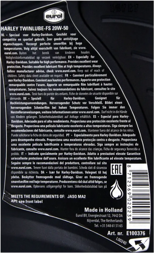 為您的哈雷機車提供最佳保護!Eurol TWINLUBE-FS 20W50 全合成機油,專為哈雷引擎設計,提供卓越的磨損保護和高溫下的潤滑性能。全合成配方確保引擎在各種駕駛條件下都能保持最佳狀態,延長引擎壽命。符合 API SJ 和 JASO MA2 標準,讓您安心使用。一瓶 1 公升裝,是您保養愛車的最佳選擇。