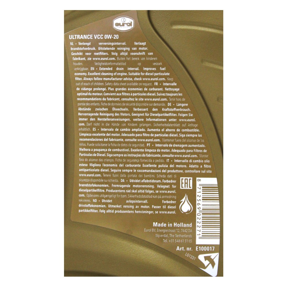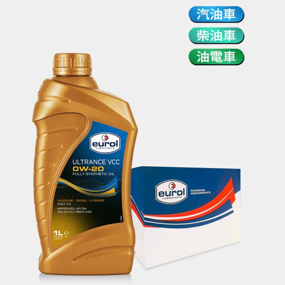 EUROL ULTRANCE VCC 0W/20 全合成機油,為您的汽油或柴油引擎提供卓越的保護。這款全合成機油採用先進技術配方,確保引擎在各種駕駛條件下都能保持最佳性能,延長引擎壽命。0W/20的黏度等級提供優異的低溫啟動性能,同時減少摩擦,提升燃油經濟性。經VOLVO VCC RBS0-2AE認證,符合ACEA C5標準,品質值得信賴。每罐1公升裝,方便您隨時補充,確保愛車引擎始終保持最佳狀態。