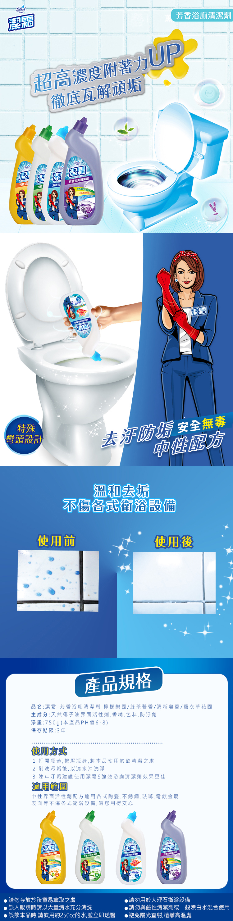 花仙子潔霜芳香浴廁清潔劑,讓您的浴室煥然一新,散發清新綠茶馨香。此款浴廁清潔劑採用中性配方,溫和不傷浴廁表面,適用於各種材質,讓您安心使用。超高濃度的清潔劑能有效瓦解頑垢,輕鬆去除浴廁內的污漬和異味,讓清潔工作更省時省力。每瓶容量750g,液態型態方便使用,是您維持浴廁清潔芳香的最佳選擇。告別髒污,迎接清新潔淨的衛浴空間!