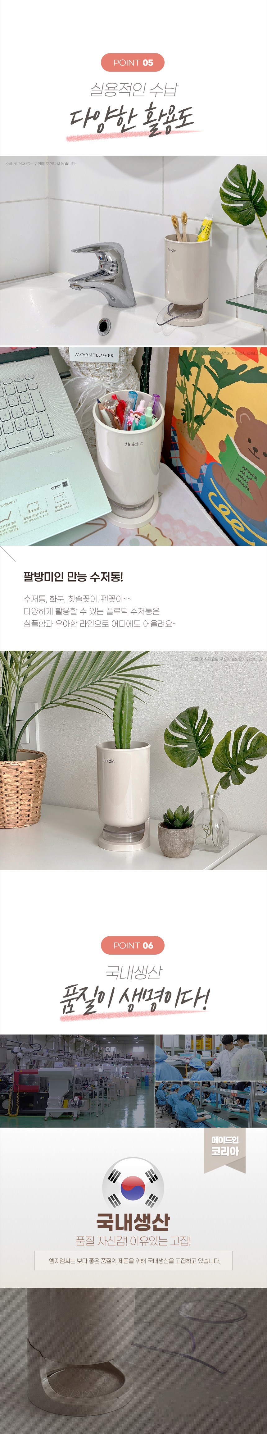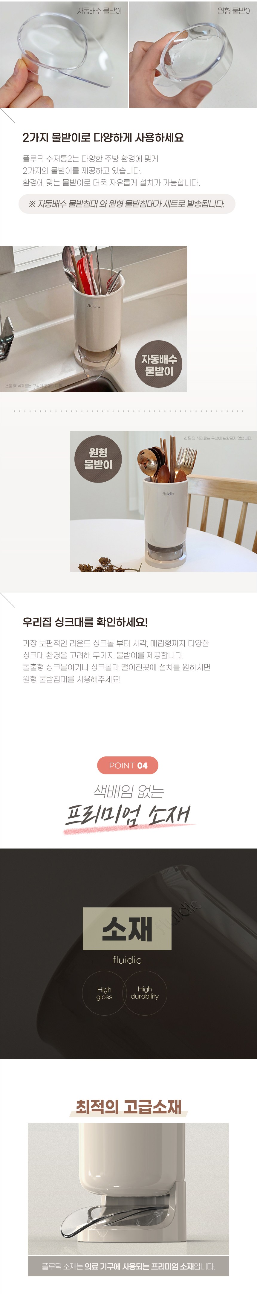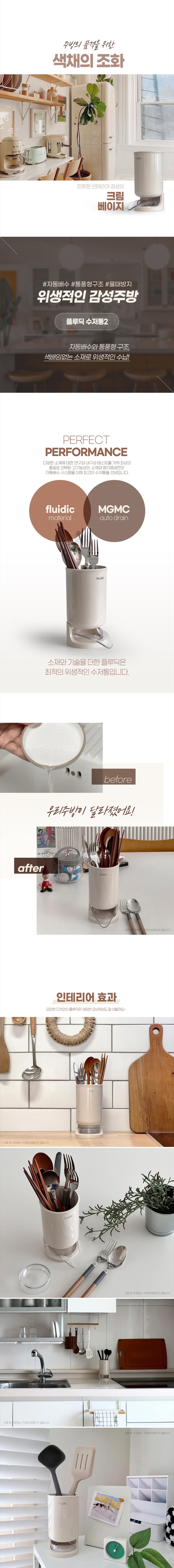 Fluidic 自動排水餐具筒採用獨家自動排水技術,能快速排出餐具上的水分,保持乾燥衛生。奶油米色外觀簡約時尚,能完美融入各種廚房風格。此餐具筒採用優質材料製成,不易染色,易於清潔,讓您輕鬆維持廚房整潔。除了收納餐具,還能作為花盆、牙刷架或筆筒使用,用途廣泛。韓國製造,為您的廚房生活增添更多便利與品味。兩種接水盤設計,適用於各種廚房環境。