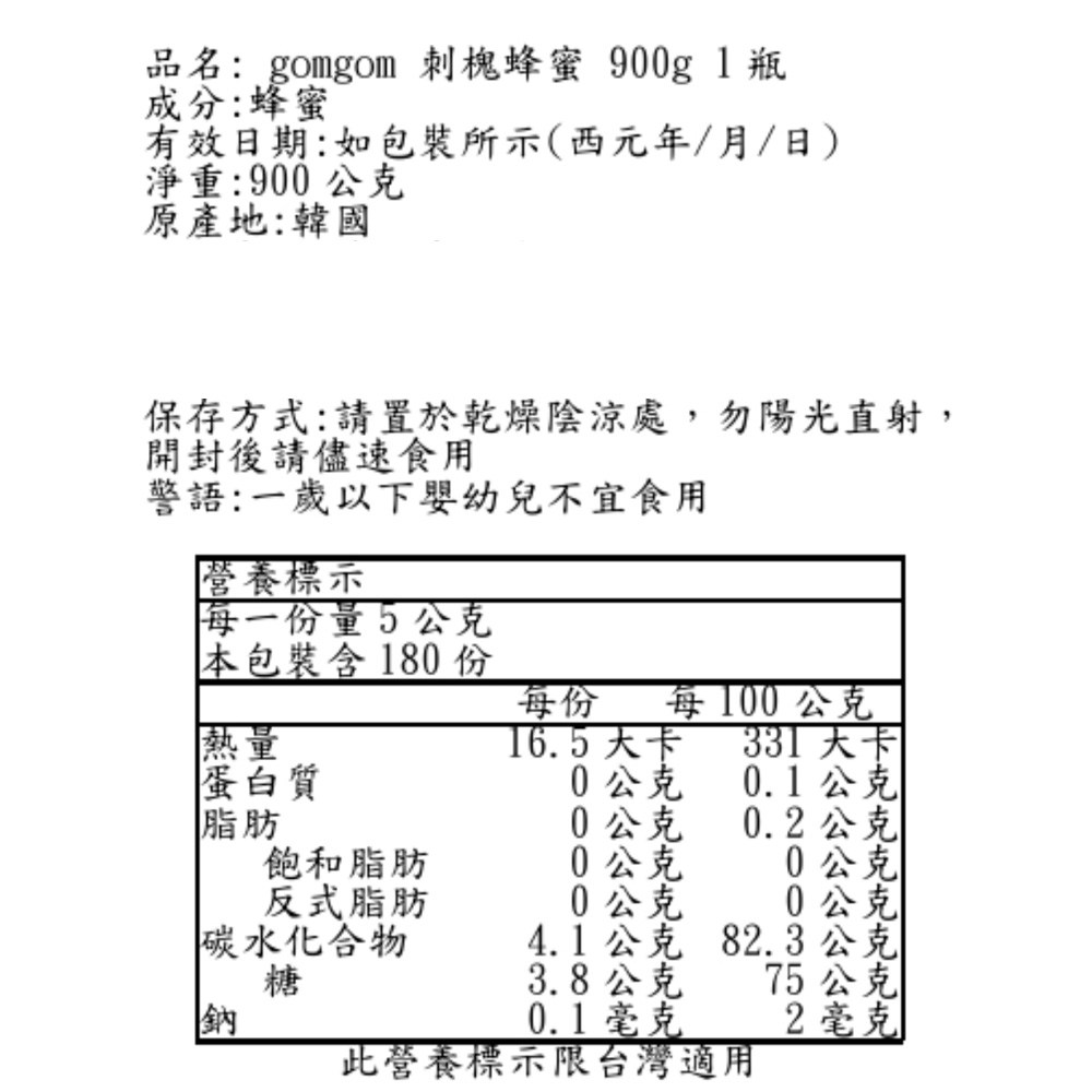 - 嚴選韓國產刺槐蜂蜜,口感清甜,為您的生活增添一絲甜蜜滋味。
