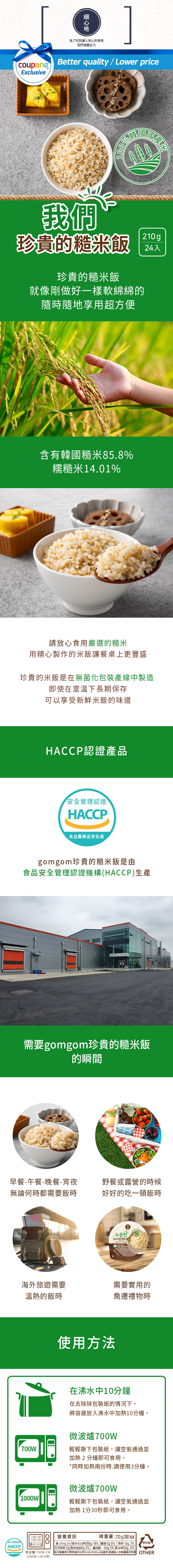 想輕鬆享受健康美味的糙米飯嗎?gomgom 即食糙米飯是您的最佳選擇!每包含有 85.8% 的糙米和 14.01% 的糯米,口感Q彈,營養豐富。採用韓國產糙米,經過 HACCP 認證,安全可靠。只需微波爐加熱或隔水加熱幾分鐘,即可享用。無論是忙碌的上班族、學生,還是追求健康飲食的人士,gomgom 即食糙米飯都是方便快捷的理想之選。一箱24個,讓您隨時隨地都能品嚐到美味健康的糙米飯。