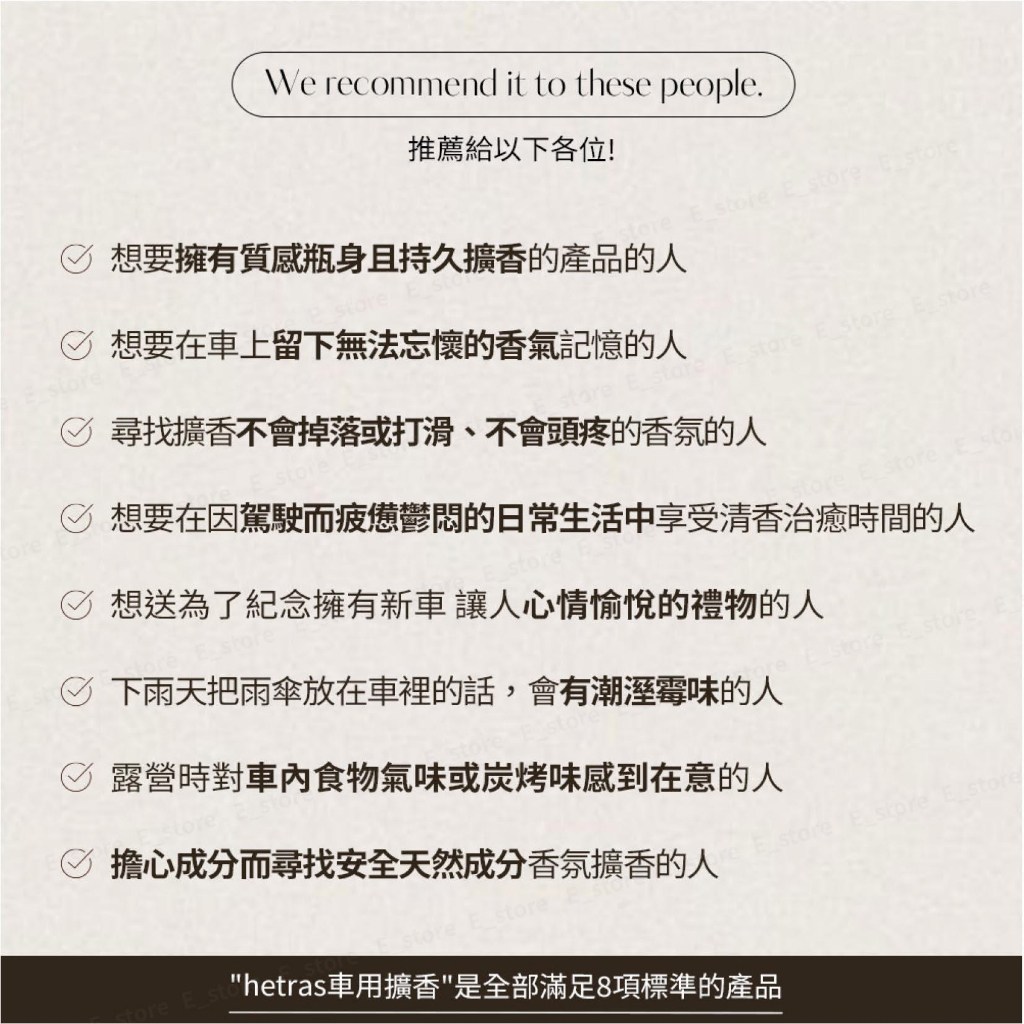 Hetras 車用擴香為您的愛車注入五星級飯店的奢華香氛體驗。這款擴香套組包含兩個精緻擴香瓶,讓您在每一次旅程中都能享受持久而迷人的香氣。採用精選原料和專業調配,散發出獨特的香調,營造出沉穩、品味和情調兼具的車內氛圍。其簡約時尚的設計,不僅能穩固地放置在車內,更能與車內裝飾完美融合,提升整體質感。此外,讓您安心使用,享受健康舒適的香氛體驗。