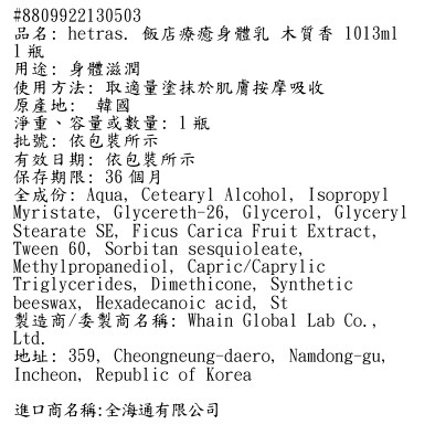 Hetras酒店木質香身體乳,大容量1.013L,讓您在家也能享受飯店級的奢華護膚體驗。蘊含珍貴青無花果萃取,能深層滋潤乾燥肌膚,並添加多種植物精華,舒緩肌膚不適。獨特的香氛配方,讓您散發持久迷人的木質香氣,彷彿置身於寧靜的森林中。清爽不黏膩的質地,能快速被肌膚吸收,給予肌膚一整天的呵護。每天使用,讓您的肌膚水潤柔嫩,散發自信光采。