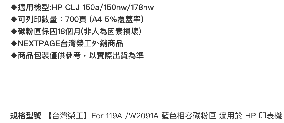 HP 119A/W2091A 青藍色碳粉匣,為您的HP彩色雷射印表機提供卓越的列印品質。原廠碳粉確保色彩鮮明、持久不褪色,讓您的文件和圖像呈現專業級效果。此碳粉匣適用於HP CLJ 150a/150nw/178nw等型號,可列印多達700頁(A4紙5%覆蓋率),滿足您的日常列印需求。選用原廠HP碳粉,不僅能確保最佳相容性,還能延長印表機的使用壽命。此外,HP致力於環境保護,此碳粉匣也易於回收,減少浪費,讓您在享受高品質列印的同時,也能為地球盡一份心力。