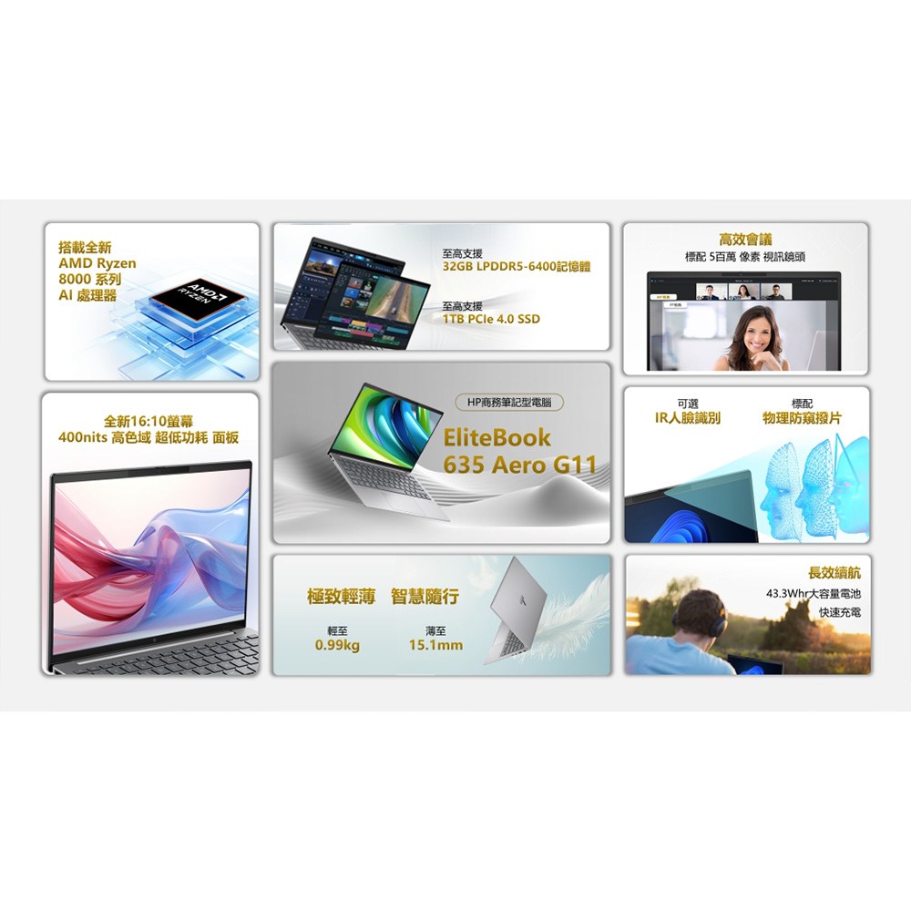 hp 惠普 EliteBook 635 Aero G11 筆記型電腦,13.3吋 WUXGA 400nits,R7-8840HS,32GB,1TB,銀色,WIN11 Pro, A2CZ0PA