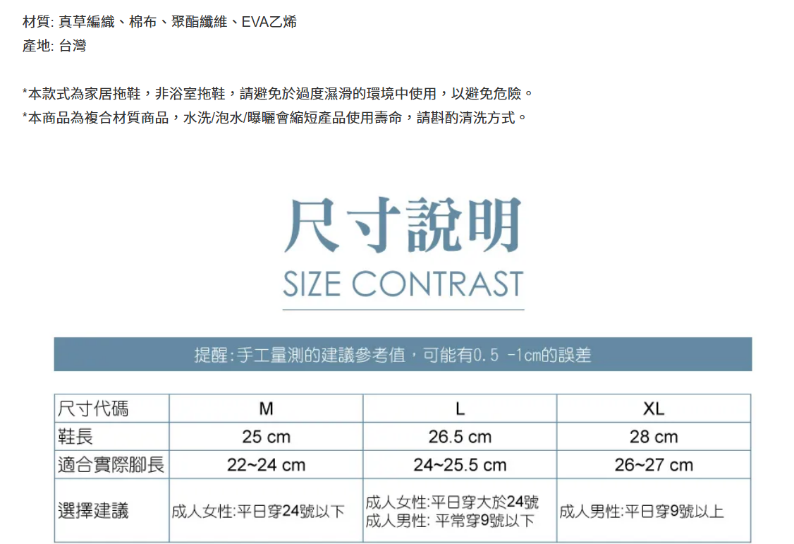 讓您的雙腳在室內也能享受片刻的小清新!台灣製造小時光真草蓆室內拖鞋,觸感舒適透氣,給您帶來清爽的居家體驗。鞋面採用精緻的時光花園青色花卉圖案,簡約時尚,男女皆宜。XL(26~27cm)尺寸,適合大部分男士和腳型較大的女士。棉布內裡柔軟親膚,聚酯纖維和EVA乙烯鞋底輕盈耐磨,讓您在家中也能輕鬆自在地行走。無論是春夏秋冬,這款真草蓆室內拖鞋都能為您的雙腳帶來舒適的呵護。