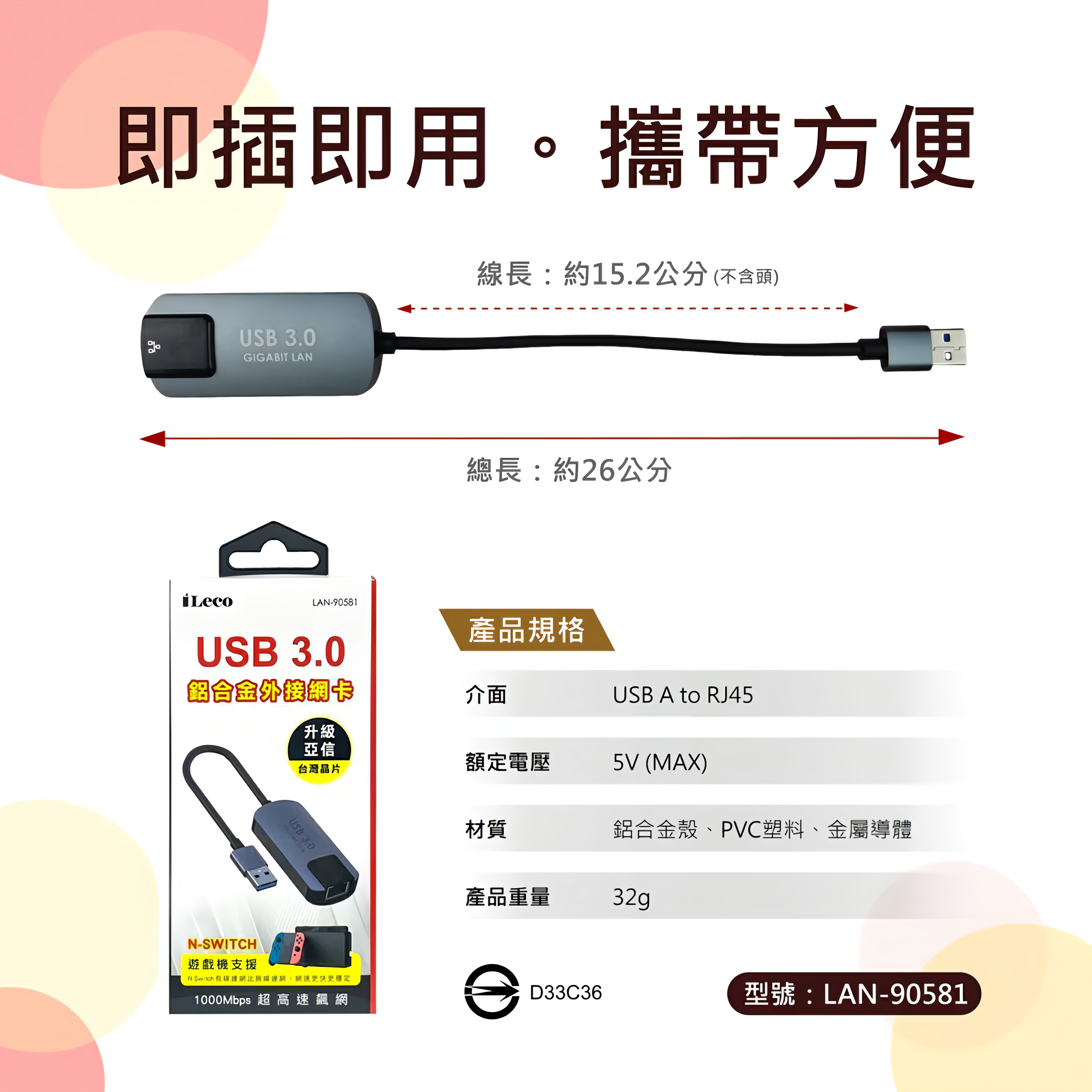 iLeco USB 3.0 千兆網卡,型號為AX88179A LAN-90581,讓您輕鬆擴充網路連接能力。此網卡採用USB 3.0介面,提供高達1000Mbps的超高速傳輸,無論是下載大型檔案、觀看高清影片或進行線上遊戲,都能享受流暢穩定的網路體驗。其鋁合金外殼不僅堅固耐用,更能有效散熱,確保長時間穩定運作。輕巧便攜的設計,讓您隨時隨地都能輕鬆連接網路,是筆記型電腦、桌上型電腦和Switch遊戲機的最佳夥伴。灰色外觀簡約時尚,完美搭配您的設備。