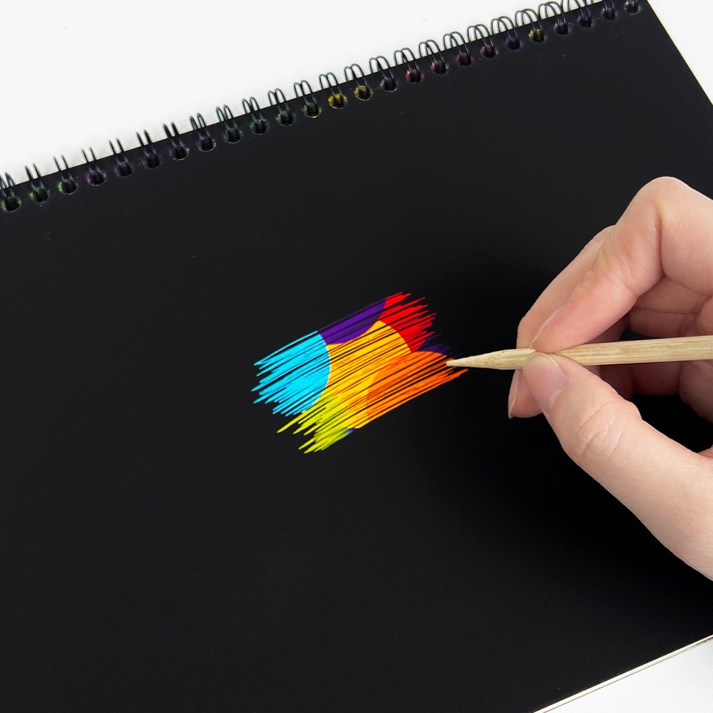 - 內含專用木筆,輕輕一刮即可顯現鮮豔的彩虹色彩,創作獨一無二的藝術作品。