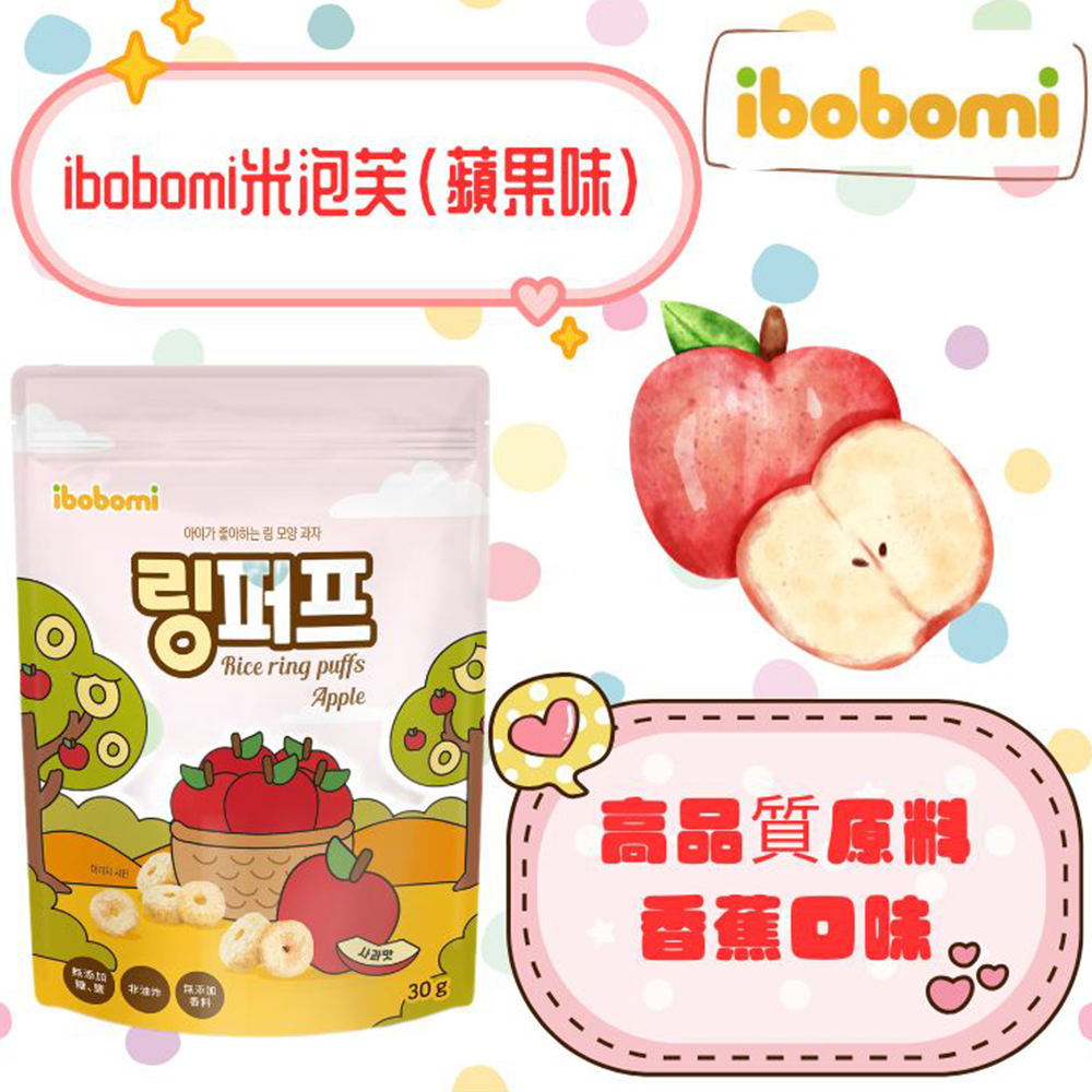 ibobomi蘋果米泡芙是專為寶寶設計的健康零食。嚴選韓國優質大米與新鮮蘋果,不添加糖、鹽、香料。酥脆的口感,入口即化,讓寶寶輕鬆享受美味,同時訓練咀嚼能力。可愛的圈圈造型,方便寶寶抓握,激發對食物的興趣。獨立小包裝,方便攜帶,是外出遊玩的理想點心。
