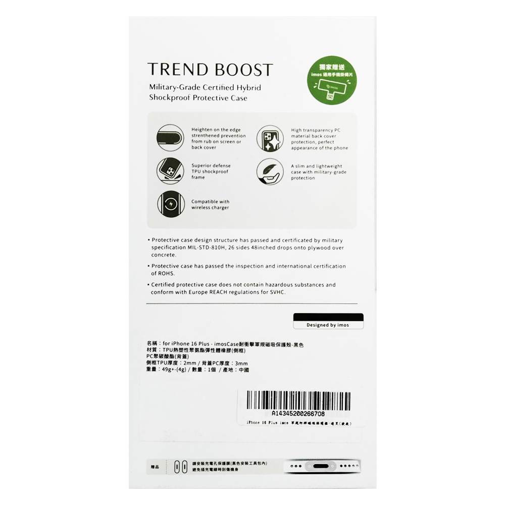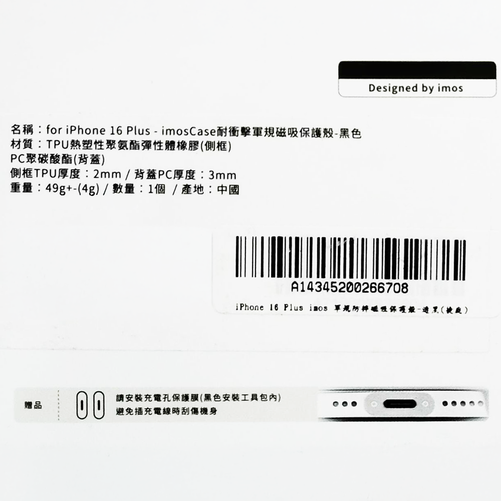 imos 軍規防摔磁吸保護殼,為您的 iPhone 16 Plus 提供極致保護。這款黑色保護殼通過軍規 MIL-STD-810H 認證,能有效吸收衝擊,保護手機免受意外摔落的損害。採用 TPU 熱塑性聚氨酯彈性體邊框和高透明 PC 材質背蓋,兼具耐用性和時尚感,完美展現 iPhone 的外觀。磁吸設計方便安裝和拆卸,同時兼容無線充電功能,讓您隨時保持電力充沛。輕巧的 49 克重量,不會為您的手機增加額外負擔,是追求安全與便利的最佳選擇。
