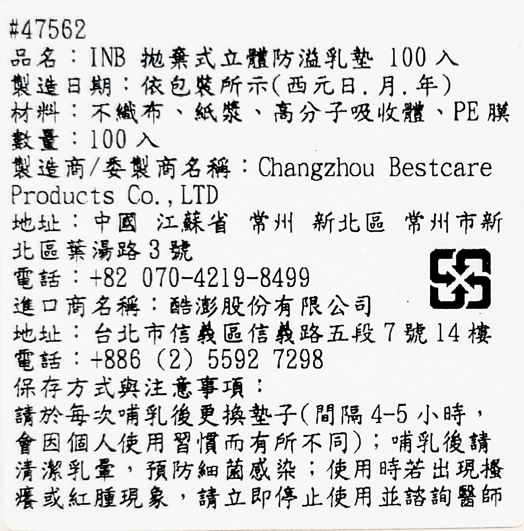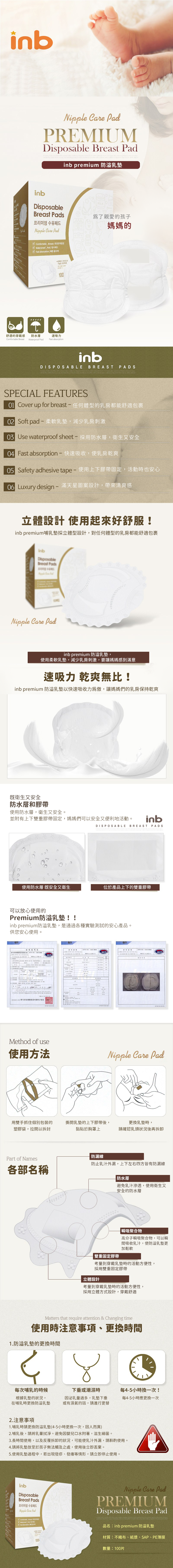 呵護媽咪的健康與舒適,Inb 立體防溢乳墊為您帶來全方位的保護。每盒包含100片獨立包裝的立體防溢乳墊,採用柔軟不織布材質,溫和親膚,給予乳房輕柔呵護。高分子吸收體能迅速吸收溢出的乳汁,保持乾爽舒適,避免濕悶感。立體剪裁設計,完美貼合胸型,讓您隨時隨地都能安心自在。雙重固定膠帶,牢固不易移位,活動自如,是哺乳期媽咪的必備好物。
