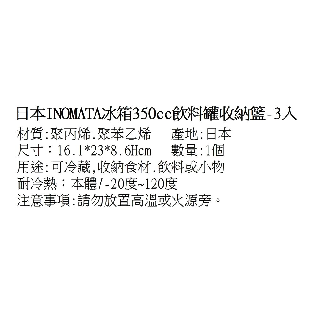 日本INOMATA冰箱飲料罐收納籃,是您冰箱整理的理想選擇。這款收納籃採用聚丙烯和聚苯乙烯材質,堅固耐用,可安全用於冷藏環境。尺寸為23 x 16.1 x 8.6公分,專為收納350cc飲料罐設計,讓您的冰箱空間更整潔有序。每組包含3個收納籃,方便您分類存放不同飲品或食材。耐冷熱溫度範圍為-20度至120度,用途廣泛,不僅可收納飲料,還可存放其他小物件或食材,讓您的冰箱空間利用率更高。