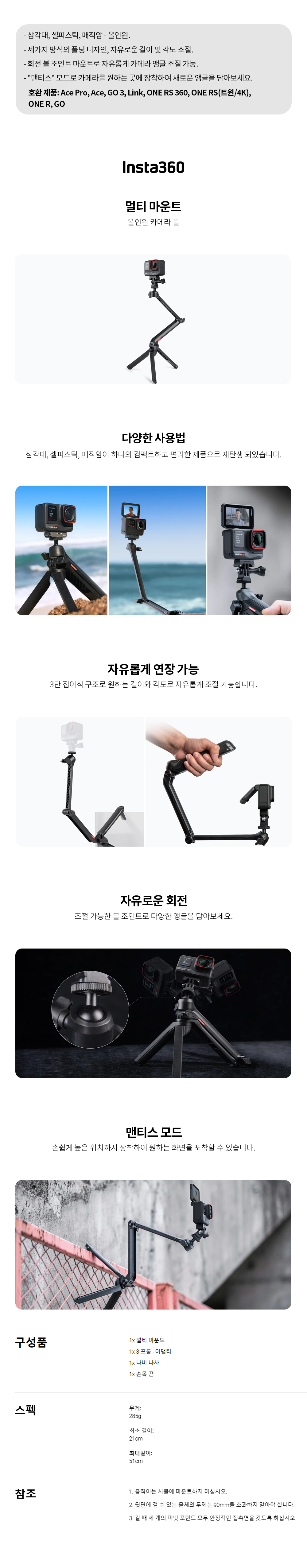 - Insta360多功能支架結合三腳架、自拍棒與魔術臂,輕巧設計讓您隨時隨地輕鬆拍攝。