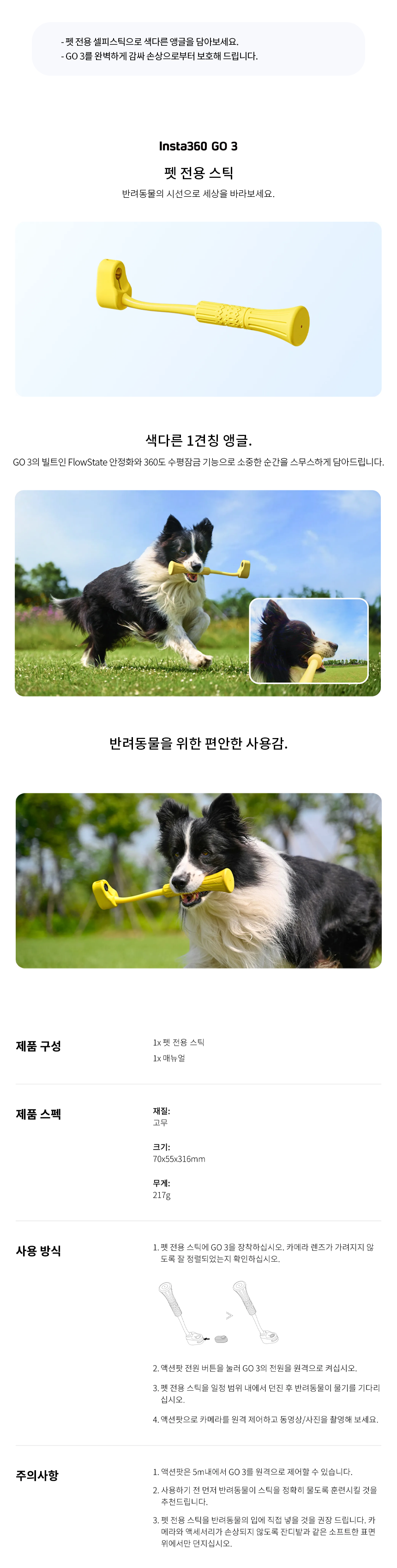 Insta360 GO 3寵物專用棒讓您以全新的視角記錄與寵物的互動。這款自拍棒專為GO 3設計,能完美包裹並保護相機免受損壞。透過寵物專用棒,您可以輕鬆捕捉到獨特的第一人稱視角,並利用GO 3內建的FlowState穩定功能,確保影片的流暢度。使用Action Pod,您還可以在5公尺內遠程控制GO 3,輕鬆拍攝影片和照片。建議您在使用前先訓練寵物正確地叼住棒子,並在柔軟的表面上投擲,以避免相機和配件損壞。
