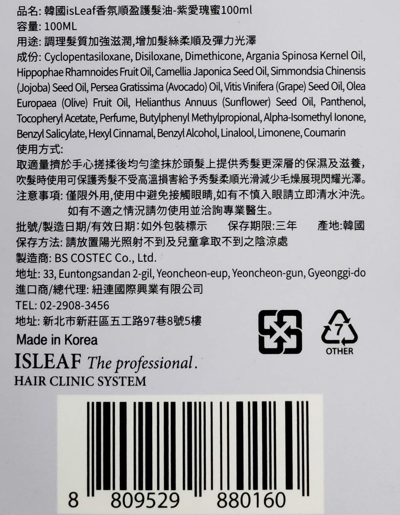 isLeaf香氛順盈護髮油,蘊含紫愛瑰蜜的精華,為您的秀髮帶來奢華的呵護。這款100ml的護髮油,適合所有髮質,能深層滋養髮絲,增加柔順度和彈力光澤,讓秀髮煥發健康光彩。其獨特的香氛配方,讓您在使用時享受愉悅的感官體驗,同時有效修護受損髮質,使秀髮更加柔順易梳理。isLeaf護髮油不含酒精,溫和呵護頭皮,讓您安心使用,展現自信美麗。