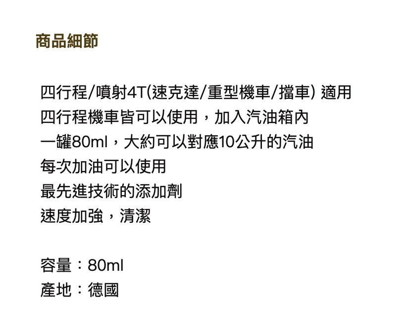 - 本產品能有效減少引擎積碳,延長引擎壽命,讓您的愛車保持最佳狀態。