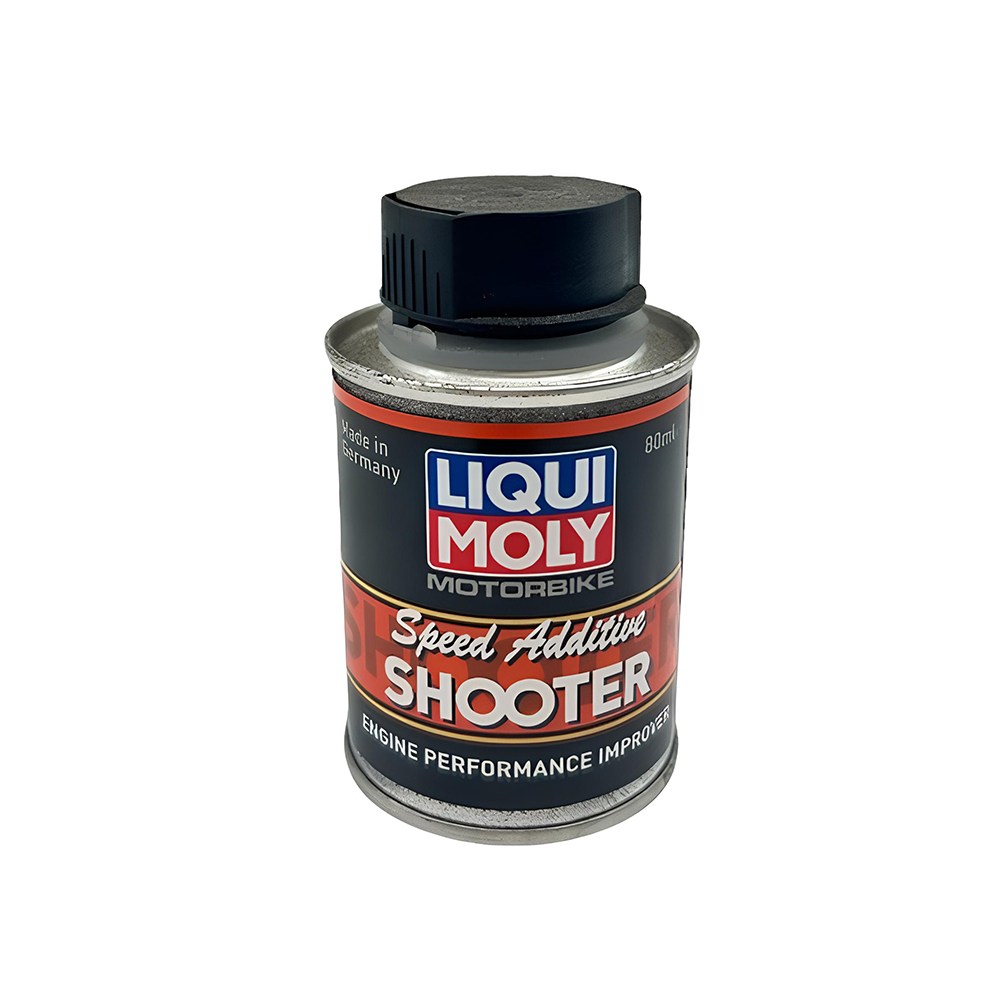 LIQUI MOLY 力魔 SHOOTER 4T 機車汽油效能提升劑,專為四行程機車設計,有效提升汽油效能,讓您的愛車重拾活力。這款汽油精採用最先進技術,能深層清潔引擎,加速性能,使您的機車運行更順暢、更高效。每瓶80ml,適用於10公升汽油,每次加油皆可使用,方便快捷。德國原裝進口,品質保證,讓您安心使用,體驗速度與清潔的完美結合。選擇力魔,為您的愛車提供最佳呵護。