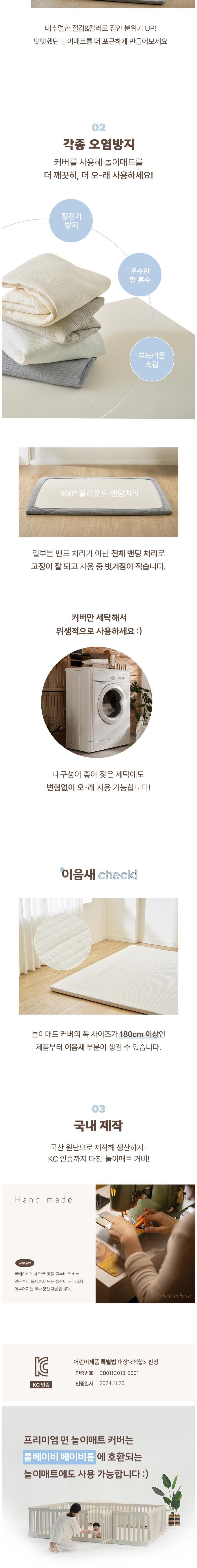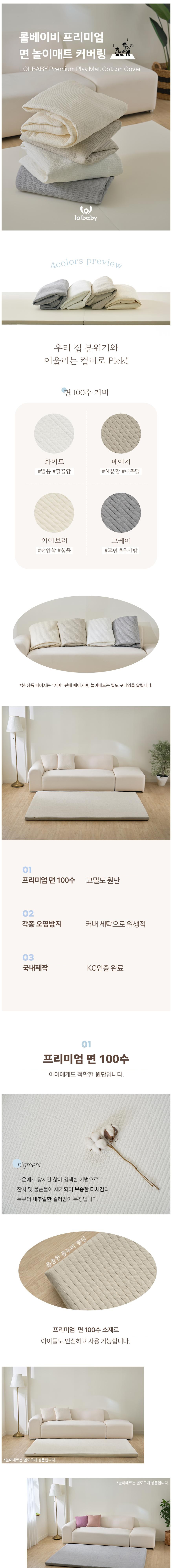 lollababy 優質棉質遊戲墊套,採用親膚柔軟的棉質布料,給寶寶帶來舒適的觸感體驗。多種顏色可選,輕鬆融入各種居家風格,為寶寶打造溫馨舒適的遊戲空間。墊套可拆洗設計,方便媽媽們清潔維護,讓寶寶隨時都能在乾淨衛生的環境中玩耍。韓國製造,讓您使用。此墊套適用於多種尺寸的遊戲墊,為您的遊戲墊提供完善的保護。