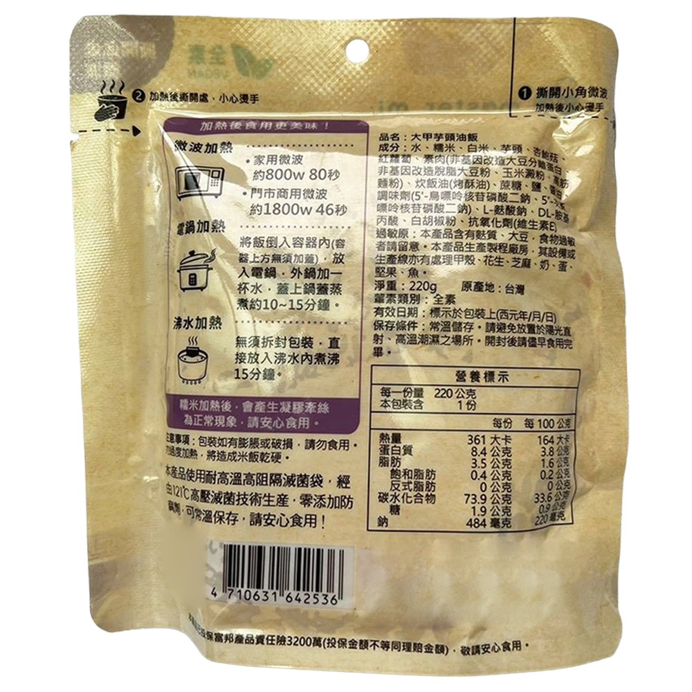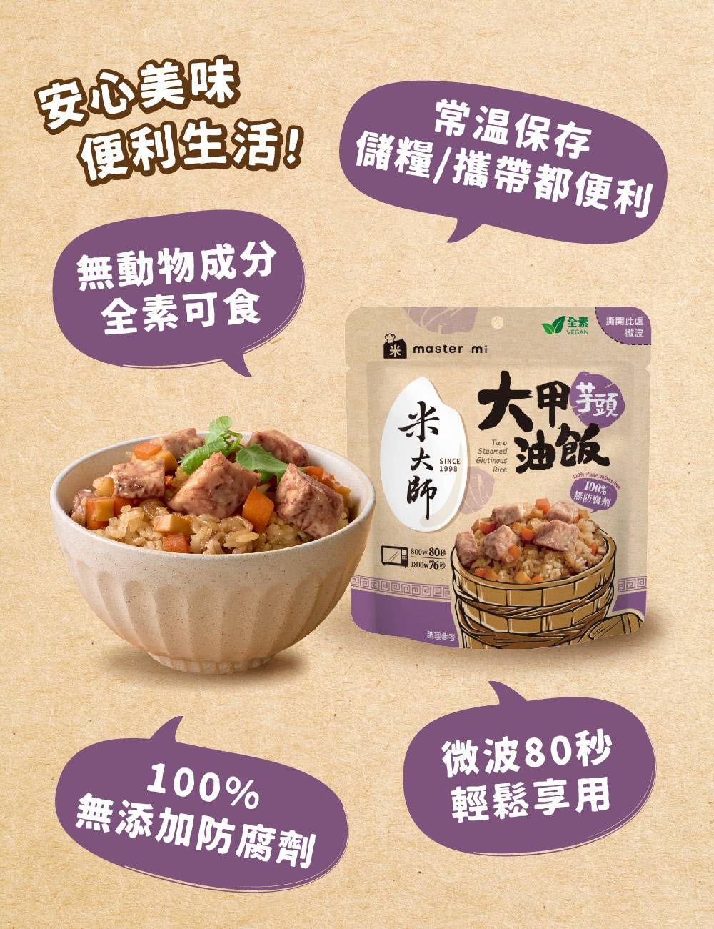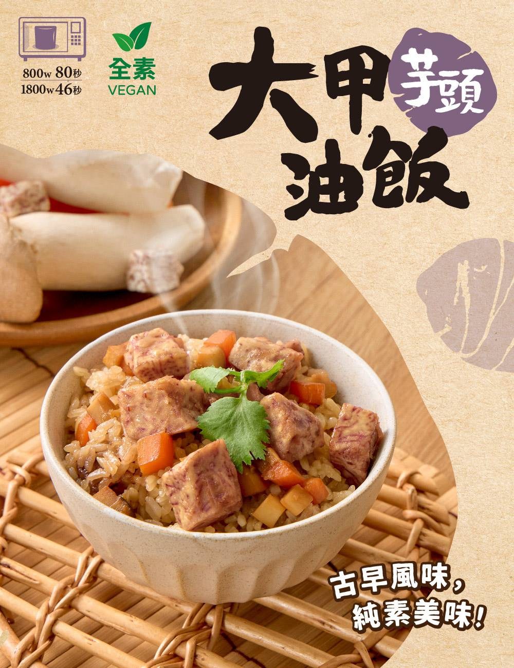 米大師大甲芋頭油飯,嚴選台灣在地的大甲芋頭,搭配Q彈飽滿的糯米,以傳統工法製作而成。芋頭口感綿密鬆軟,糯米Q彈有嚼勁,兩者完美結合,帶來豐富的口感層次。只需簡單加熱,即可輕鬆享用,方便又美味。無添加防腐劑,讓您安心品嚐,感受台灣傳統美食的魅力。