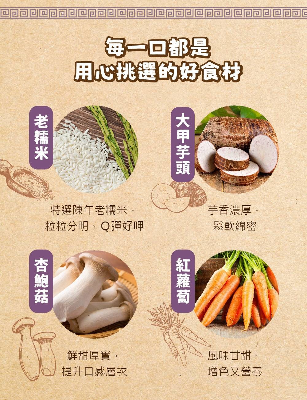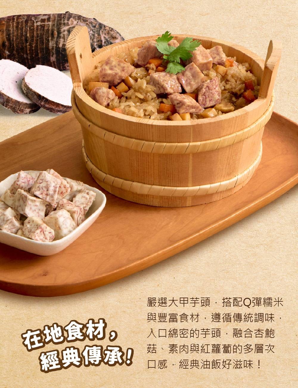 - 嚴選上等糯米,口感Q彈有嚼勁,與芋頭的鬆軟形成完美對比,帶來豐富的層次感。