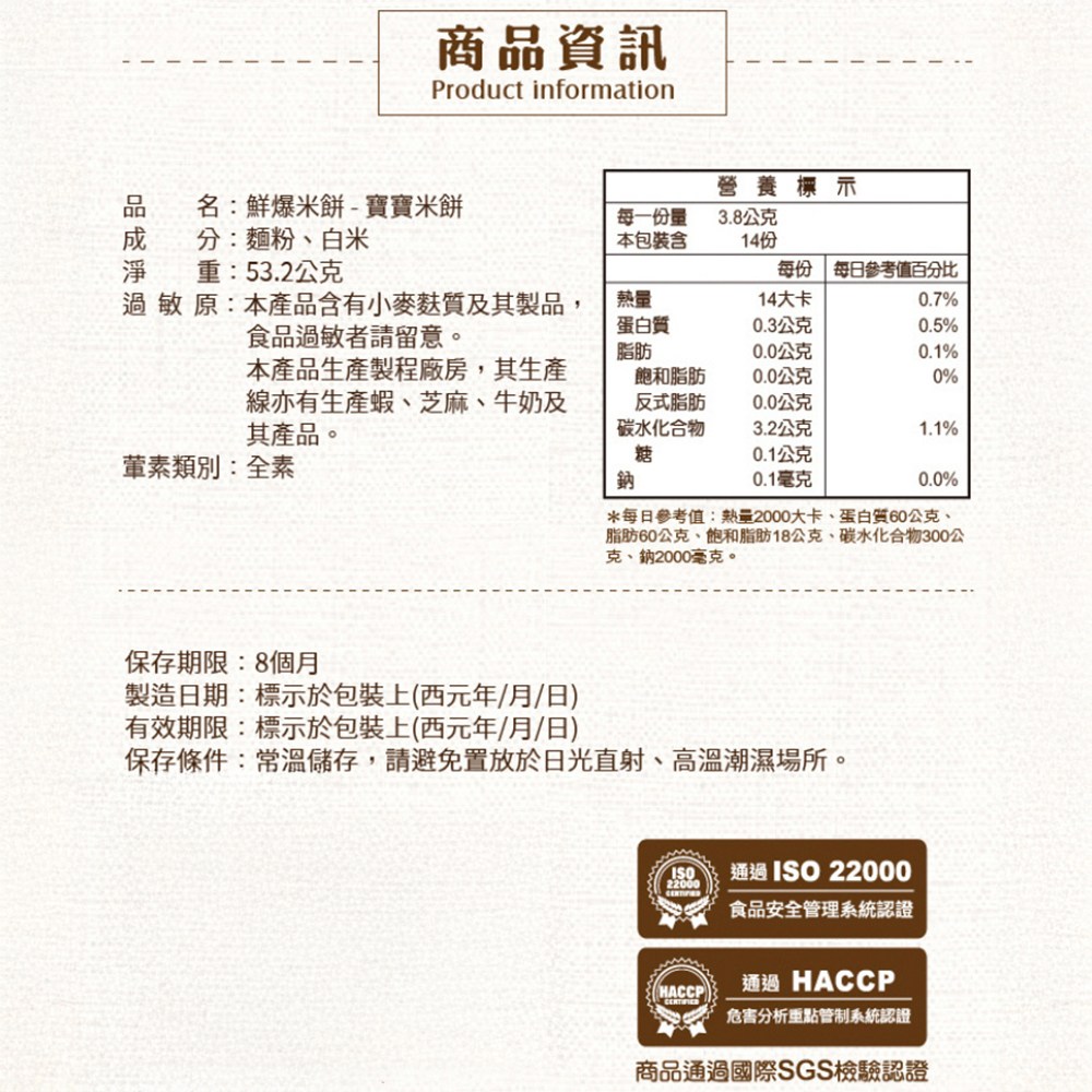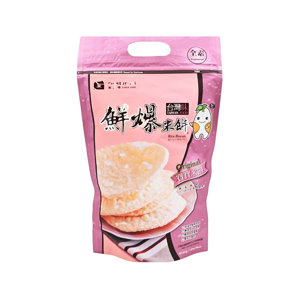 米大師鮮爆米餅,為寶寶和全家帶來健康美味的零食選擇。嚴選台灣優質蓬萊米及麵粉,以非油高壓烘焙技術製成,口感酥脆,入口即化,適合6個月以上的寶寶及各年齡層人士食用。本產品無添加人工色素及防腐劑,全素配方,讓您安心給寶寶食用。每包53.2克,獨立包裝方便攜帶,隨時隨地享受美味,是寶寶解饞、暫時充飢的理想選擇。請存放於陰涼通風處,避免高溫及陽光直射,開封後請儘快食用,以確保最佳風味。