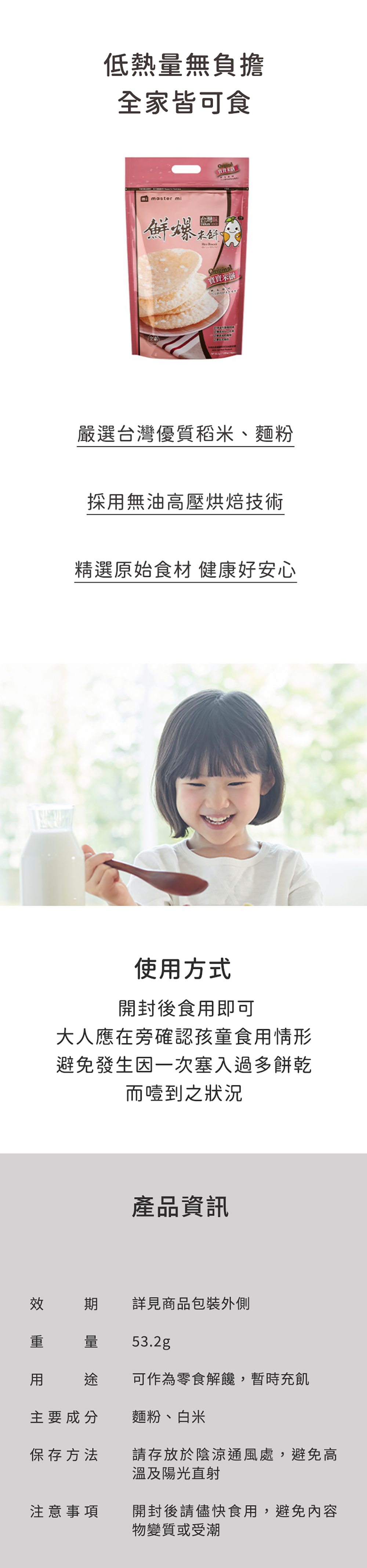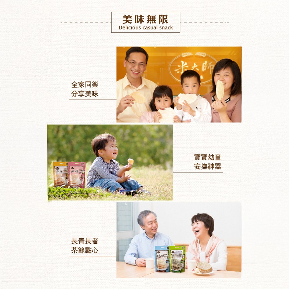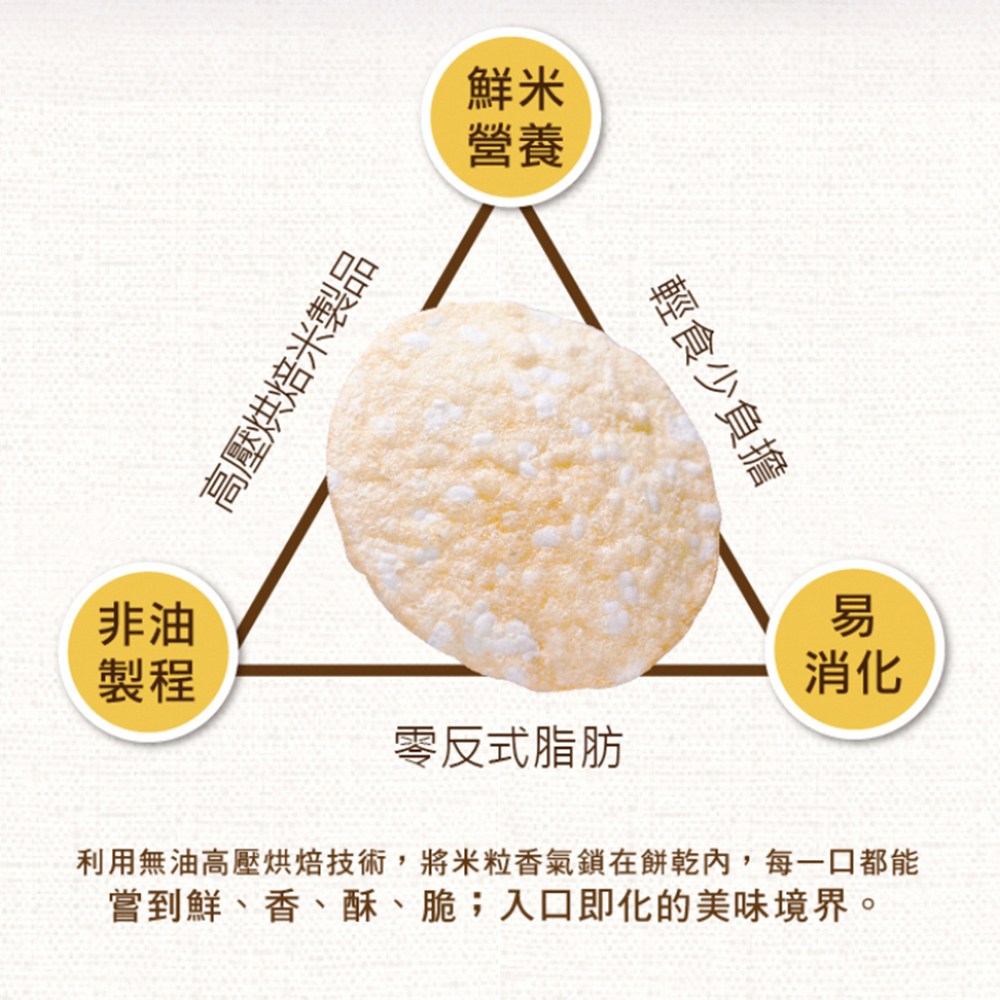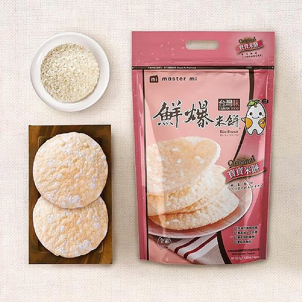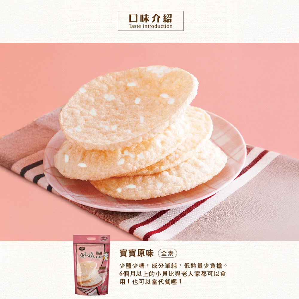 - 嚴選台灣在地好米,口感自然香甜,給寶寶最純粹的米餅體驗,享受簡單的幸福滋味。