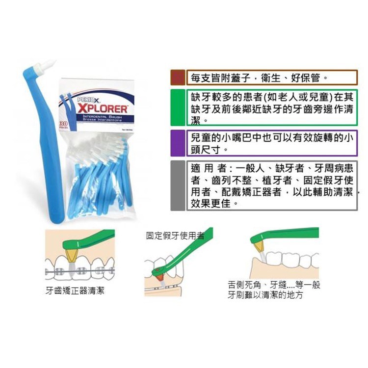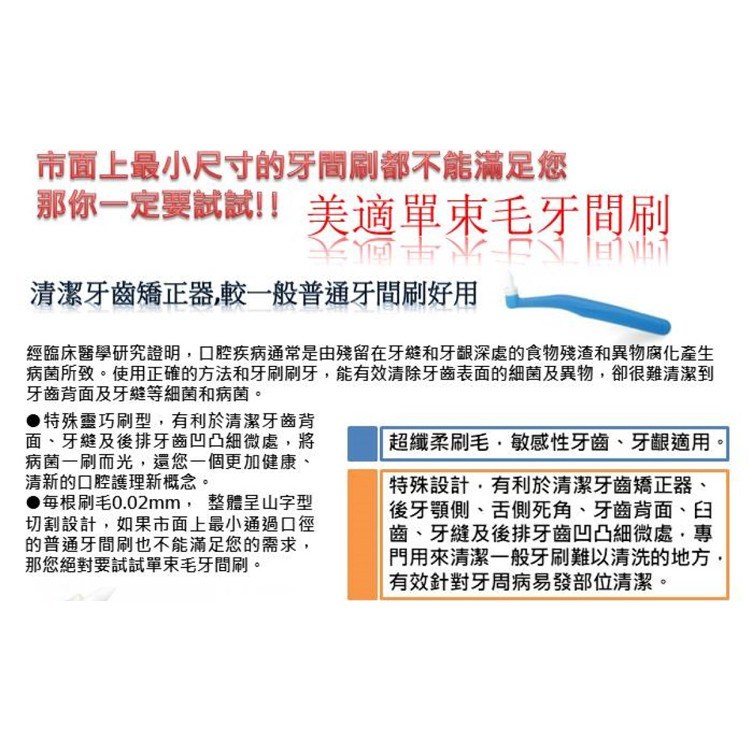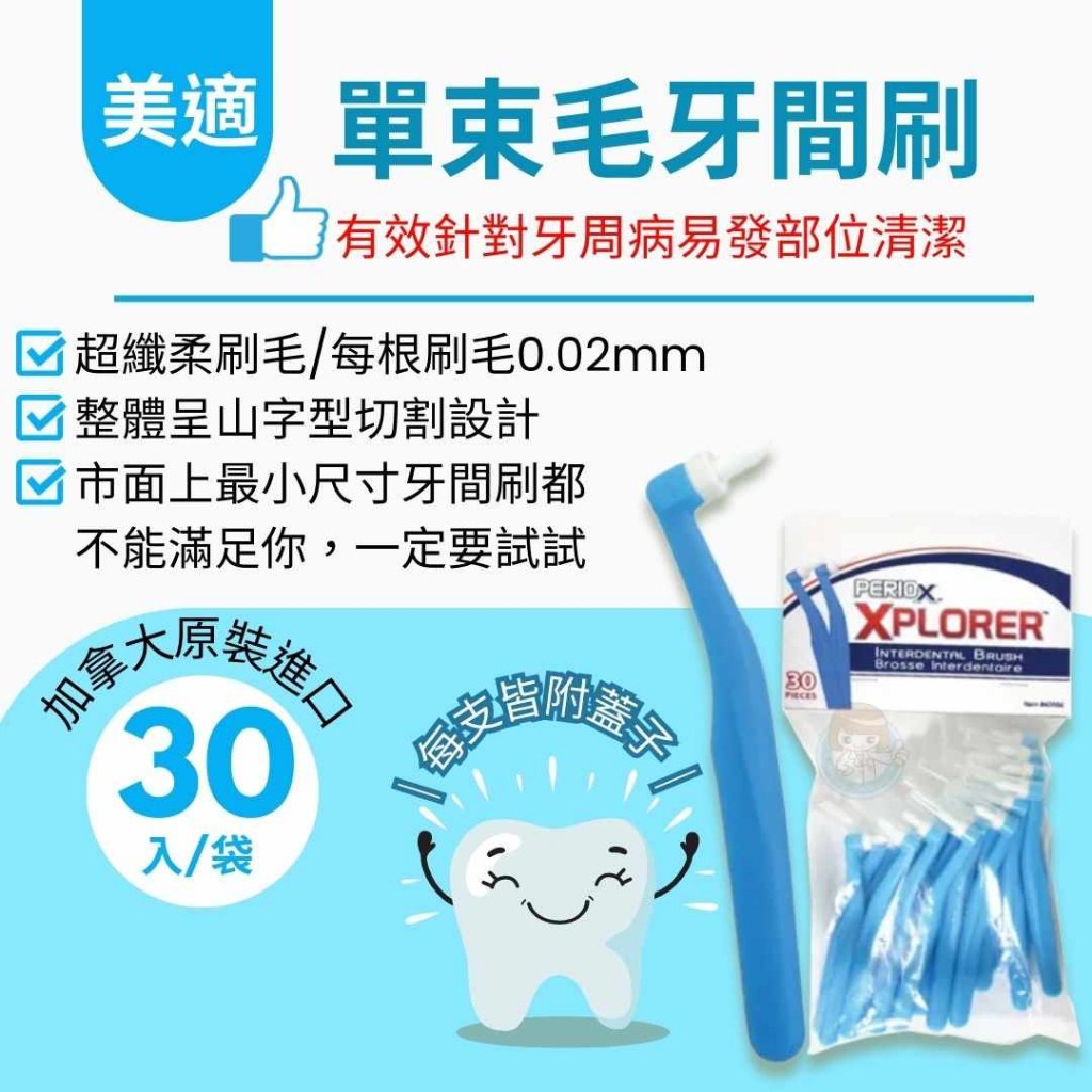 MAXILL 美適 單束毛牙間刷,每包含有30支獨立包裝的牙間刷,衛生又方便攜帶。刷毛直徑僅0.02mm,能深入清潔牙縫及牙齦溝,有效清除食物殘渣和牙菌斑,特別適合牙橋、植牙、或正在進行牙齒矯正的使用者。圓錐形刷毛設計,能更貼合牙齒形狀,清潔無死角。防滑握把設計,讓您使用時更加穩定,輕鬆掌握清潔力度。無論是成人還是兒童(需在成人監督下),都能使用這款牙間刷,保持口腔健康。