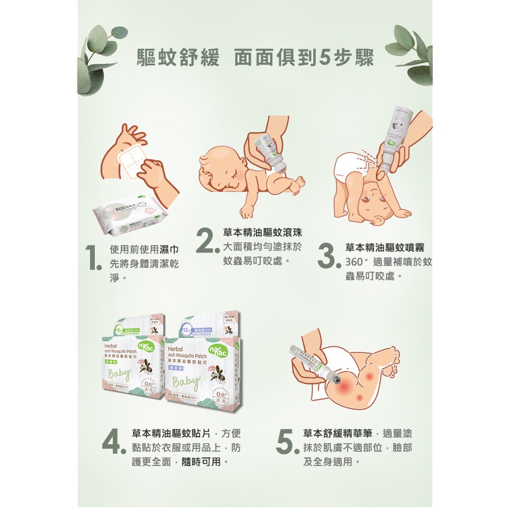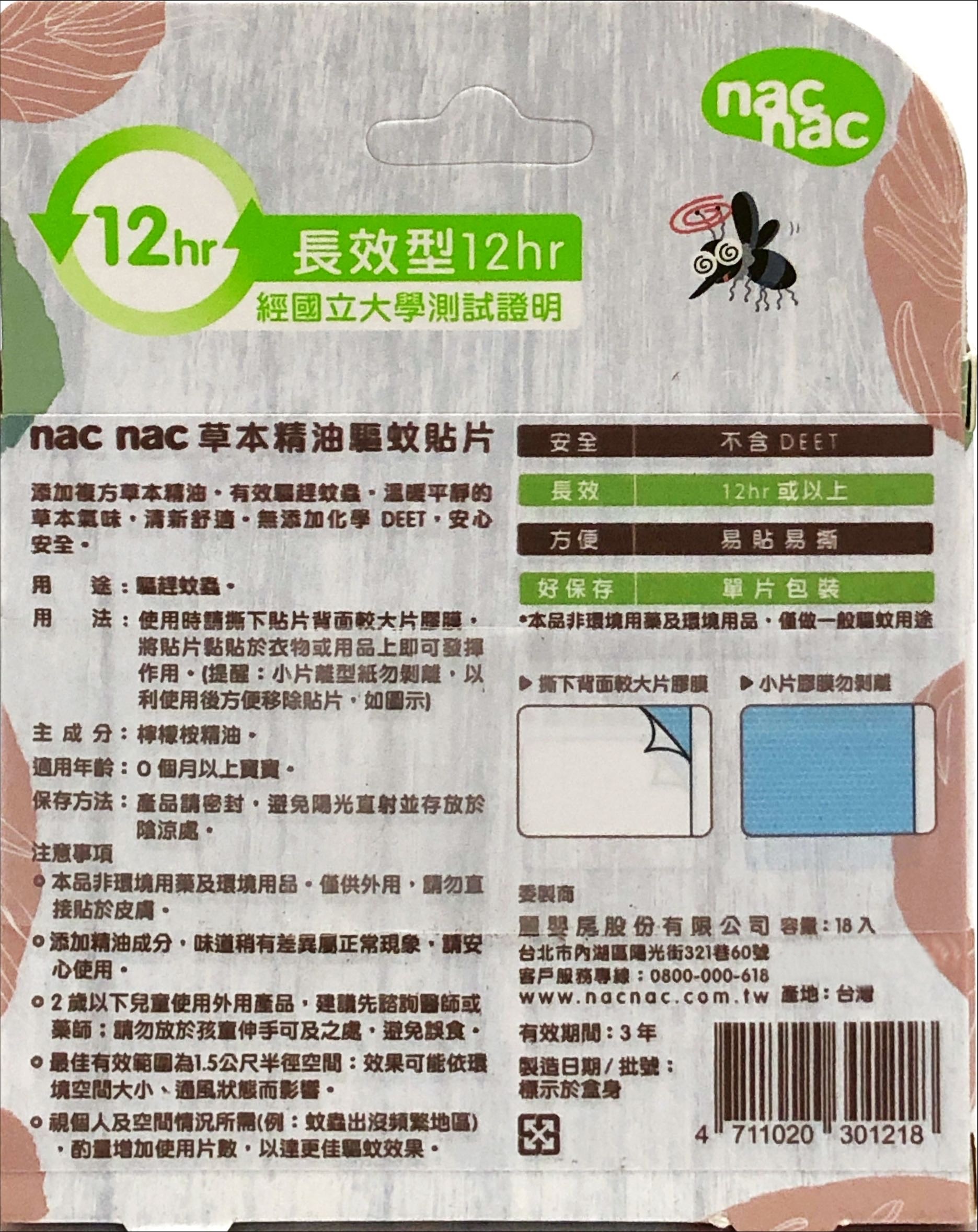 nac nac 草本精油驅蚊貼片,為您和寶寶提供長達12小時的溫和驅蚊保護,不含DEET等化學成分,安全可靠,0歲以上寶寶即可安心使用。貼片設計方便易用,只需將其貼在衣物或隨身物品上。每盒包含18片獨立包裝的驅蚊貼片,方便保存和攜帶,是居家外出、戶外活動的理想選擇。讓nac nac草本精油驅蚊貼片守護寶寶的嬌嫩肌膚,讓全家享受無憂的夏日時光。