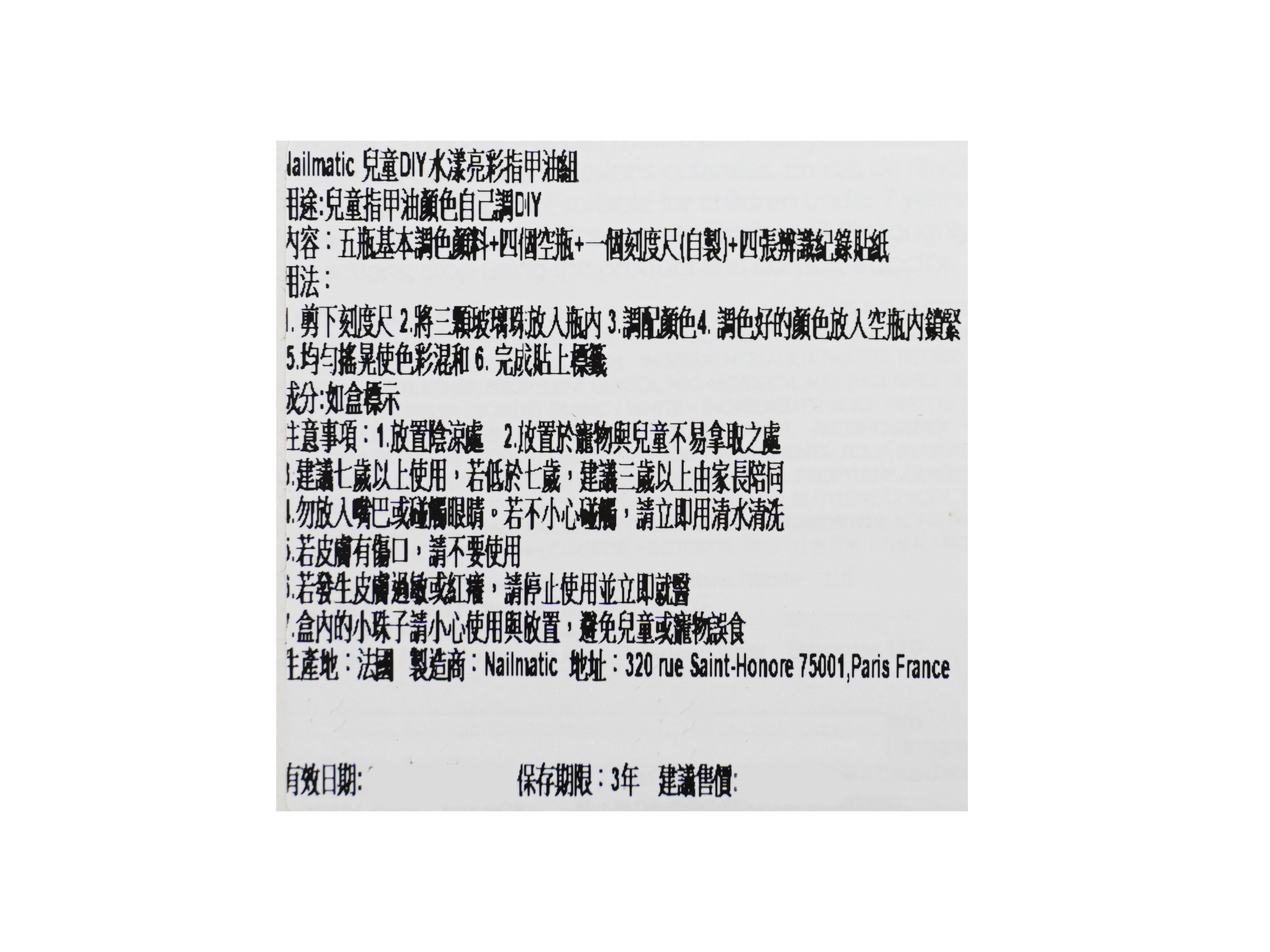 NAILMATIC 兒童DIY水漾亮彩指甲油組,讓孩子們盡情發揮創意,調配出獨一無二的指甲油色彩,不含甲醛、塑化劑等有害物質,溫和不刺激,讓孩子們安心使用。內含五種基本調色顏料、四個空瓶、刻度尺和辨識貼紙,孩子們可以根據自己的喜好,調配出各種繽紛色彩,並在瓶身上貼上獨特的標籤。不僅能培養孩子們的色彩認知能力和創造力,還能讓他們體驗DIY的樂趣,遠離螢幕,享受美好的親子時光。