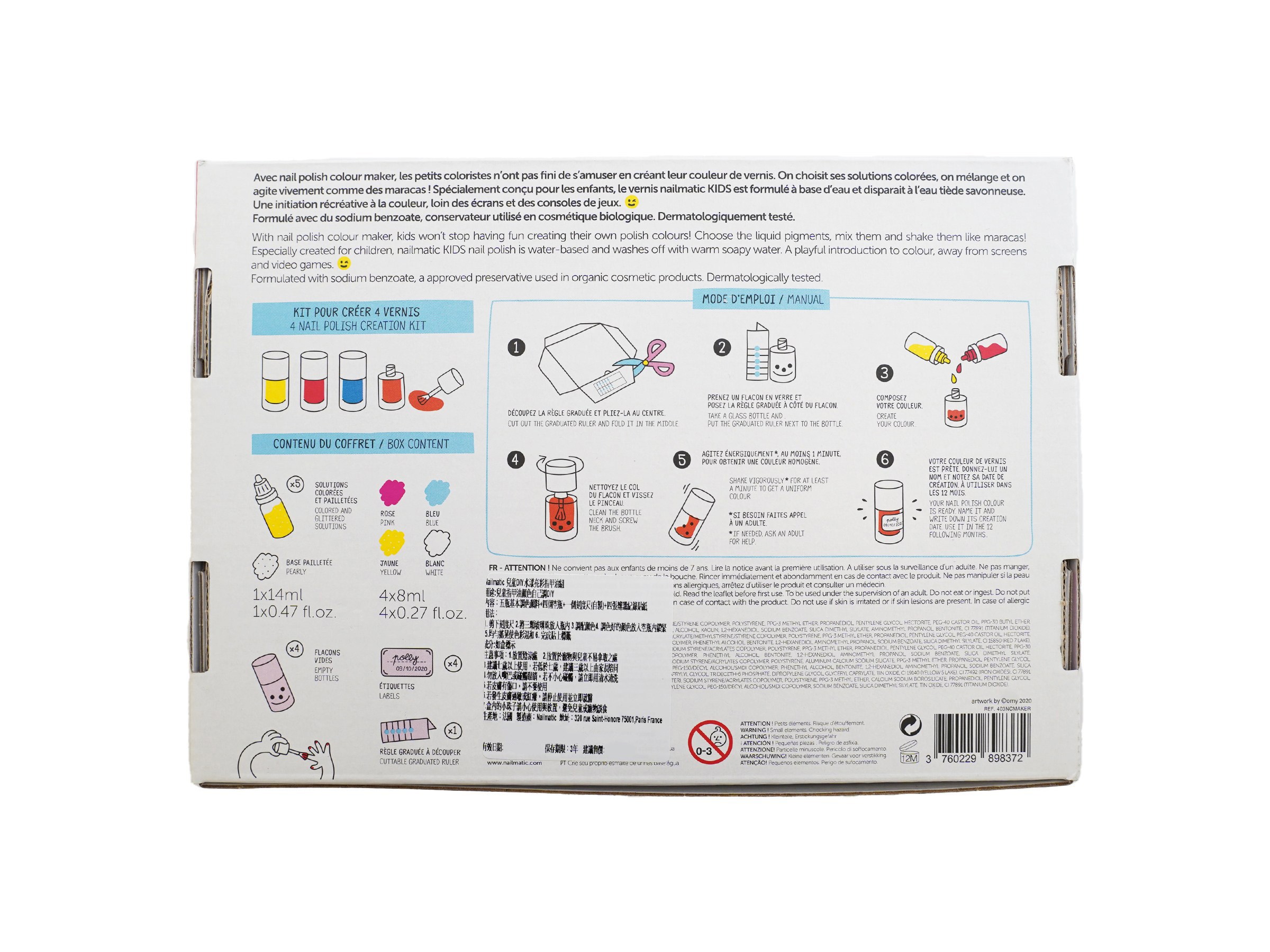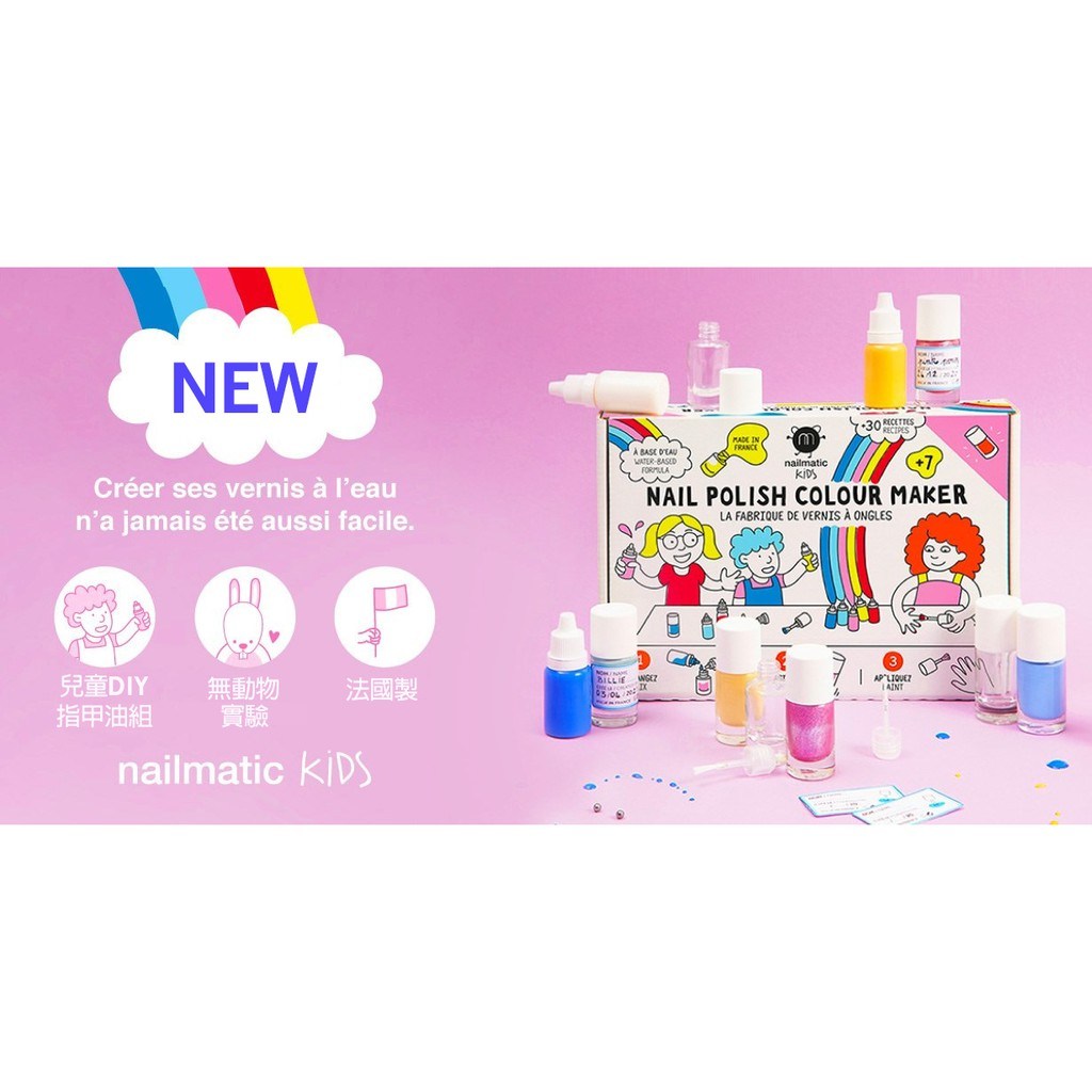 nailmatic KIDS 兒童DIY水漾亮彩指甲油組 清水可洗, 5瓶基本調色顏料 + 4個空瓶 + 1個刻度尺 + 4張辨識紀錄貼紙, 1盒
