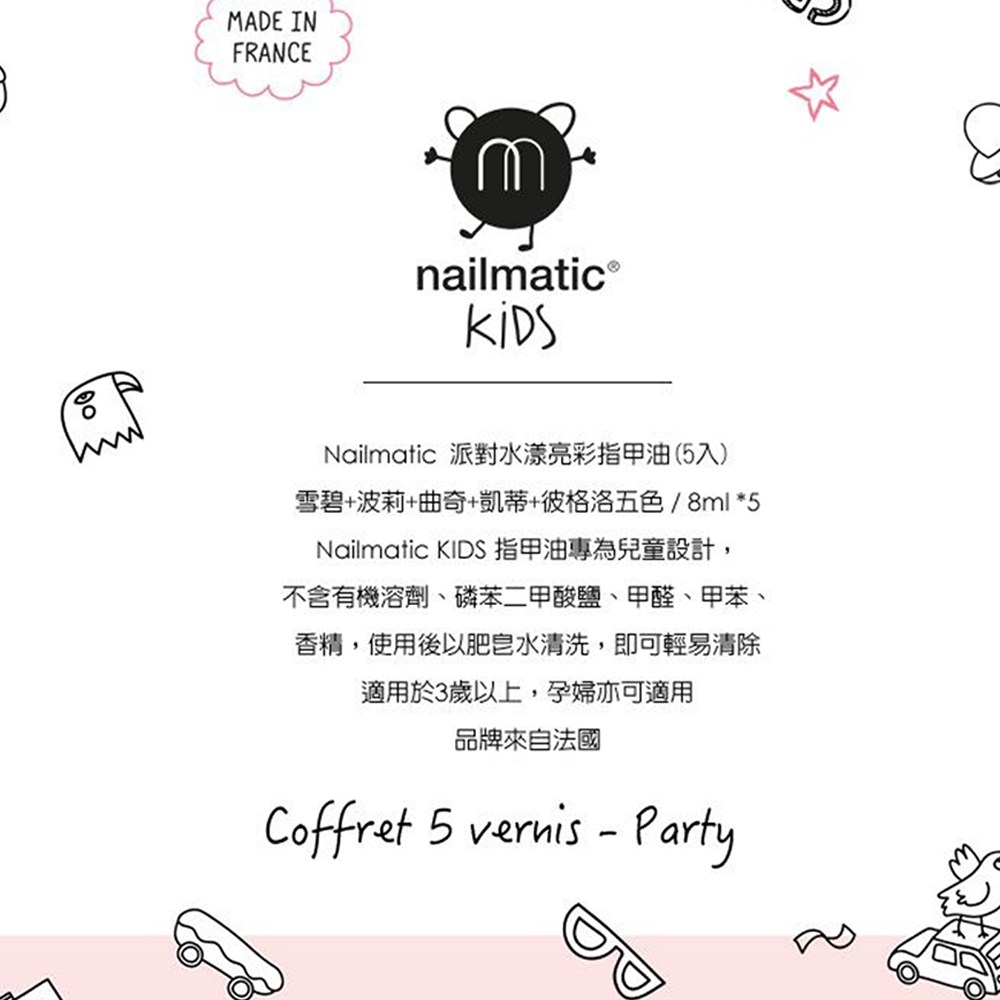 nailmatic KIDS 派對水漾亮彩指甲油組 Set 5入 雪碧+波莉+曲奇+凱蒂+格洛 法國製兒童指甲油, 5瓶指甲油, 1組