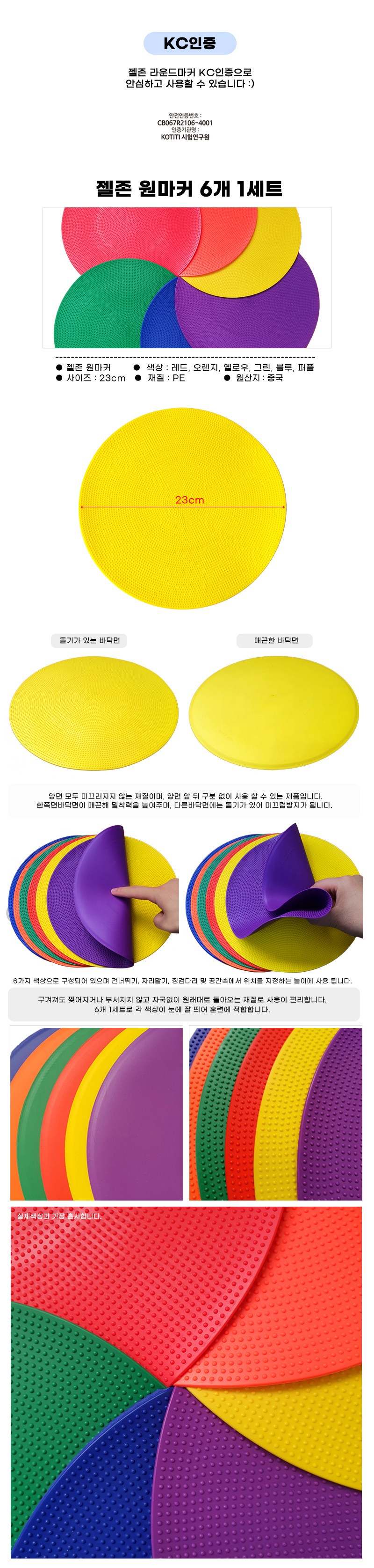 Wellzone 圓形標記碟採用安全PE材質製成,通過KC認證,讓您使用。一套包含紅、橙、黃、綠、藍、紫六種顏色,色彩鮮明,適用於跳躍、佔位等多種遊戲。標記碟雙面皆有防滑設計,一面光滑增加附著力,另一面凸起防滑,正反面皆可使用。即使揉捏也不易撕裂或破碎,能迅速恢復原狀,方便收納。尺寸為23公分,適合室內運動練習使用。