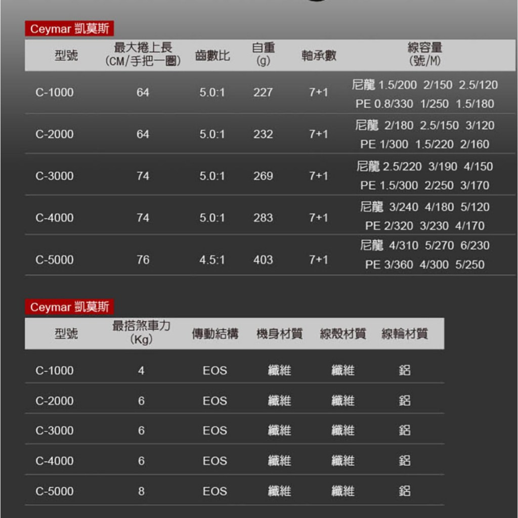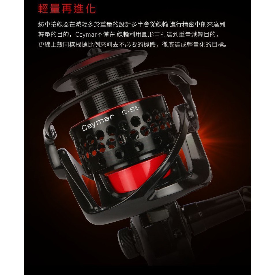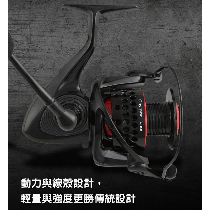 - 凱莫斯紡車式捲線器,輕巧設計讓您長時間使用也不易感到疲勞,享受釣魚樂趣。