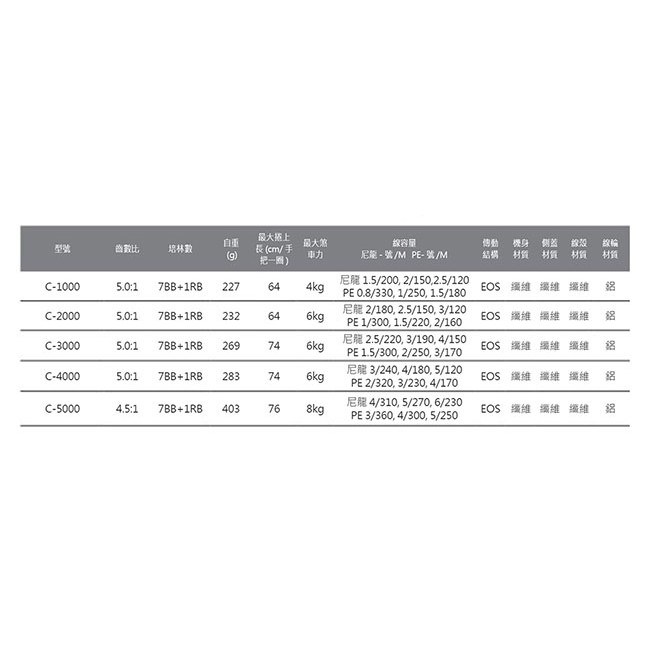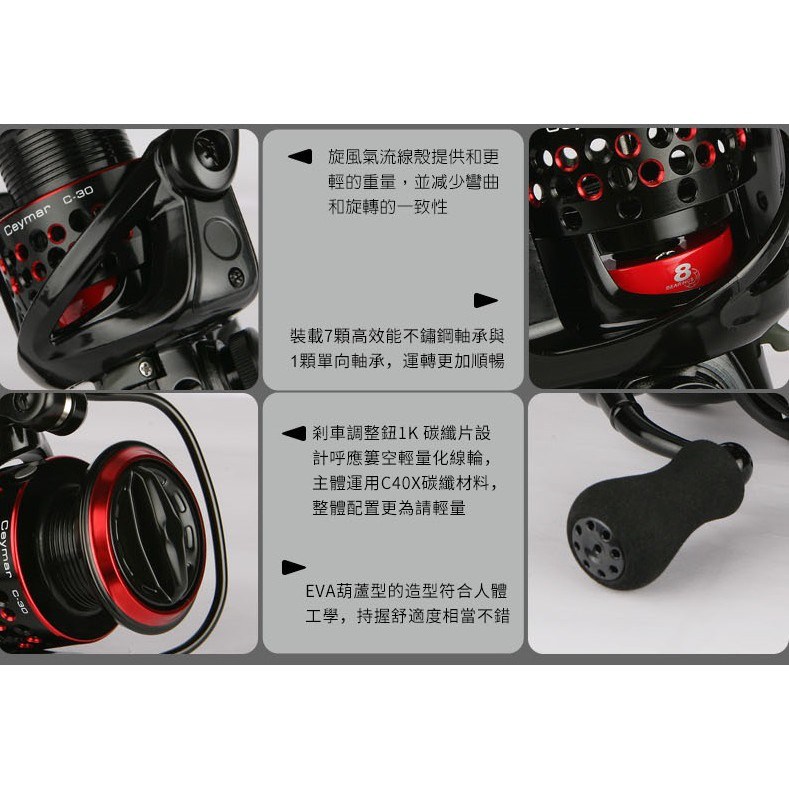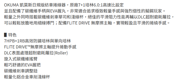 OKUMA 寶熊 CEYMAR 凱莫斯 C-2000 紡車式捲線器,是追求輕量化手感與強烈個性的釣魚愛好者的理想之選。原廠7+1培林配置和6.0:1高速比設定,確保了操作的順暢與高效。碳纖維手柄和EVA握丸,不僅輕巧,更提供了舒適的握持感。同時搭載碳纖維剎車華司和淺線杯,搭配DLC超耐磨耗拉,即使在細線搏鬥中也能輕鬆應對。FLITE DRIVE 無摩擦主軸技術,實現輕盈且平滑的捲線體驗,讓您在享受釣魚樂趣的同時,也能感受到頂級捲線器的卓越性能。