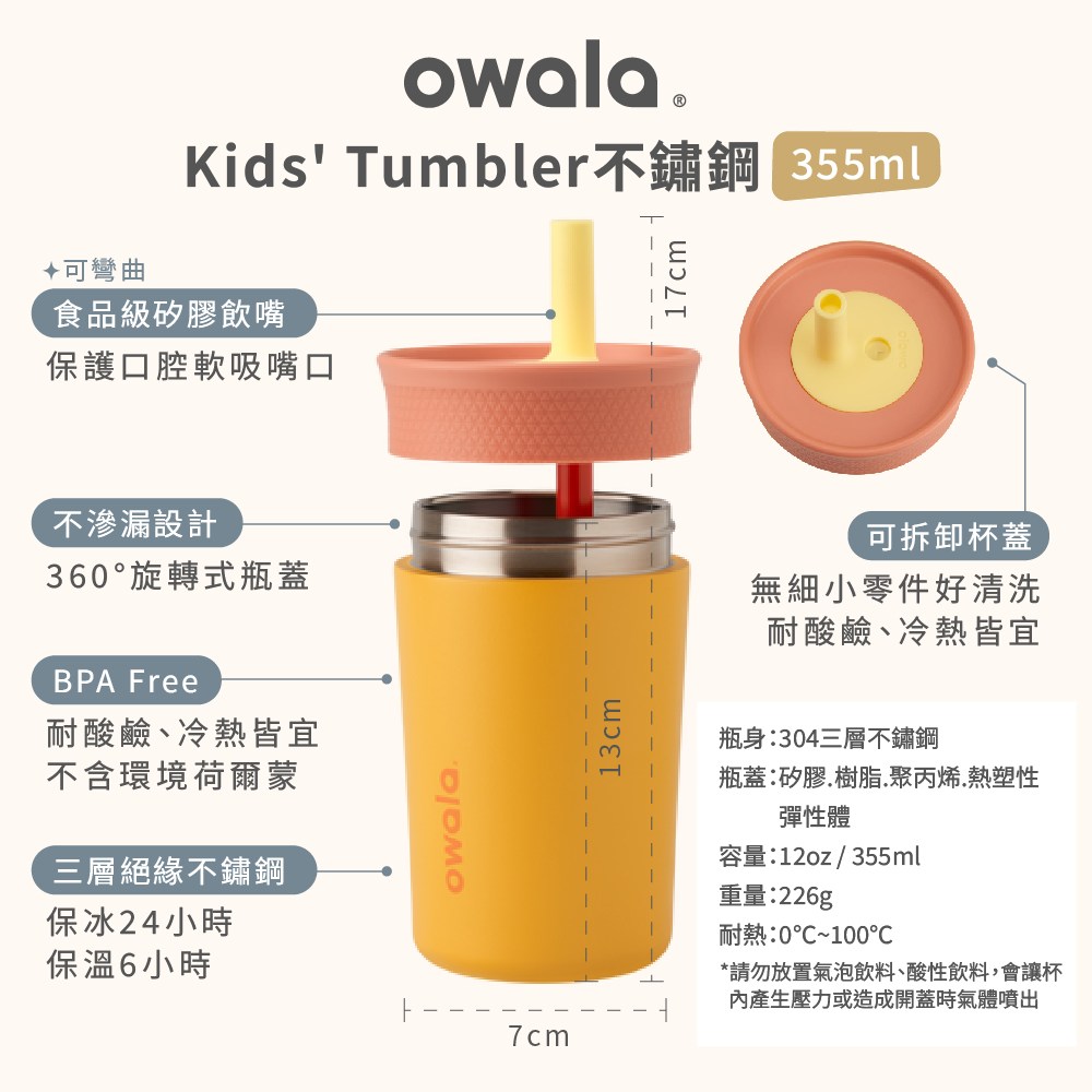 Owala 兒童不鏽鋼矽膠吸管水壺,薄荷綠,355ml,讓您的孩子隨時補充水分,保持健康活力。這款水壺採用優質304不鏽鋼材質,三層真空絕緣設計,保冷長達24小時,保溫6小時,讓孩子在任何天氣都能享用到適溫的飲品。食品級矽膠吸管柔軟安全,保護孩子嬌嫩的口腔,十字型咬嘴設計,出水穩定不嗆口,讓孩子輕鬆學會使用吸管杯。所有零件均可拆卸,方便徹底清潔,洗碗機也適用(建議放置於頂層),讓媽媽省時省力。不含BPA,耐酸鹼、耐冷熱,給孩子最安心的選擇。