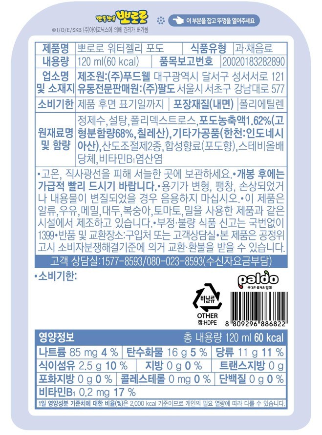 Paldo八道Pororo果凍飲葡萄口味,是一款專為兒童設計的美味果凍飲。口感軟Q,葡萄口味香甜可口,孩子們一定喜歡。獨立包裝方便攜帶,隨時隨地享受美味。此外,這款果凍飲還富含維他命B1和膳食纖維,讓孩子在享受美味的同時,也能補充所需的營養。是孩子們健康美味的零食好選擇。