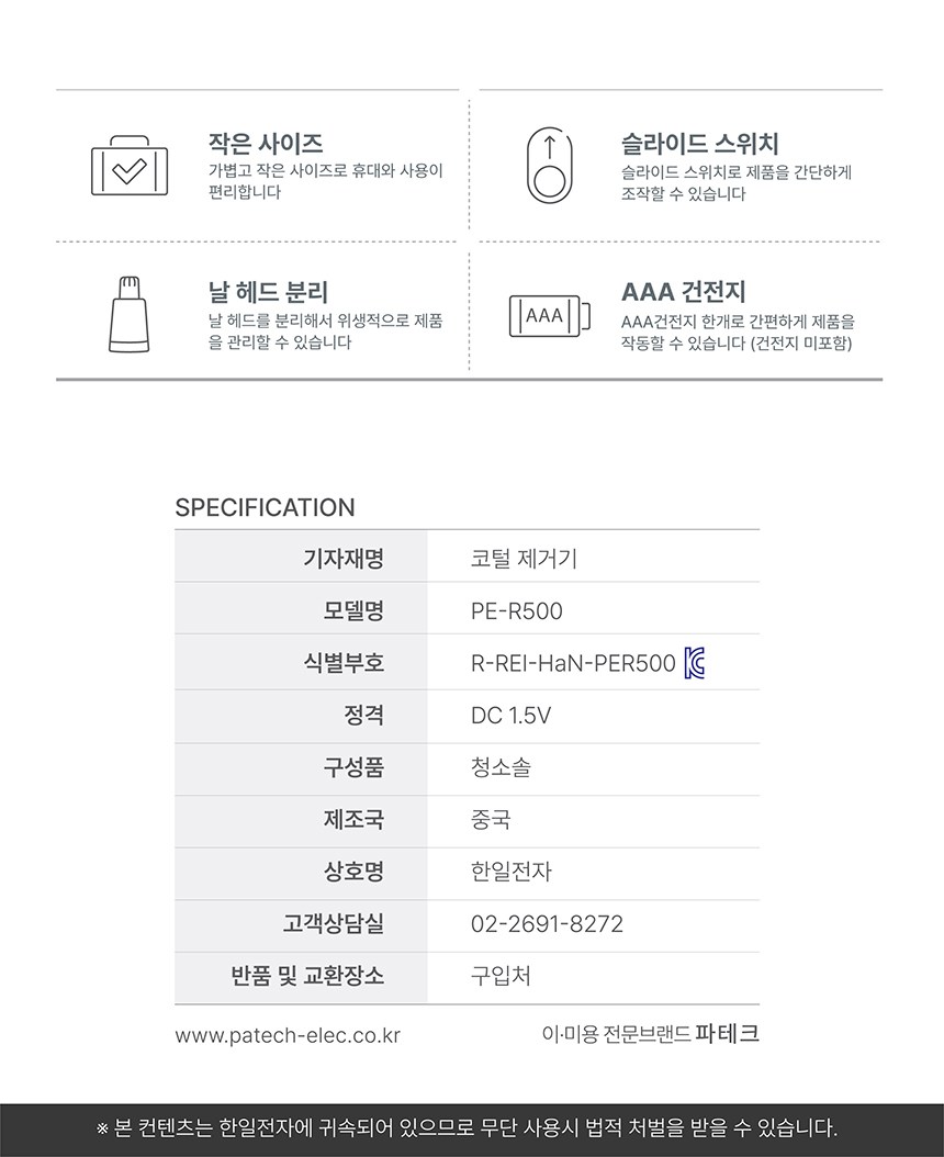 Patech 愛子鼻毛去除器 PE-R500 是一款小巧輕便的鼻毛修剪器,方便攜帶和使用。它採用滑動開關設計,操作簡單。刀頭可分離,方便清潔,確保衛生。使用 AAA 電池供電,無需充電,隨時可用。不鏽鋼立體刀片安全修剪鼻毛,避免拉扯或割傷。