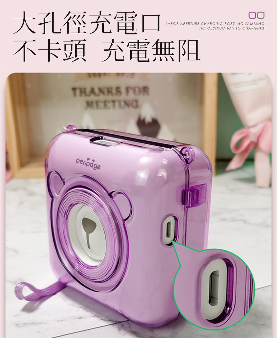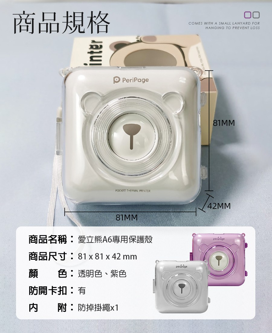 這款PeriPage愛立熊打印機專用透明保護殼。採用輕盈耐用的透明材質,完美貼合愛立熊打印機A6機身,讓您的打印機始終保持如新。卡扣式設計,安裝拆卸輕鬆便捷,附贈防掉掛繩,方便攜帶,避免丟失。大孔徑充電口設計,充電無阻礙,讓您隨時隨地暢享打印樂趣。透明外殼不影響打印效果,更可展現打印機本身的可愛造型。