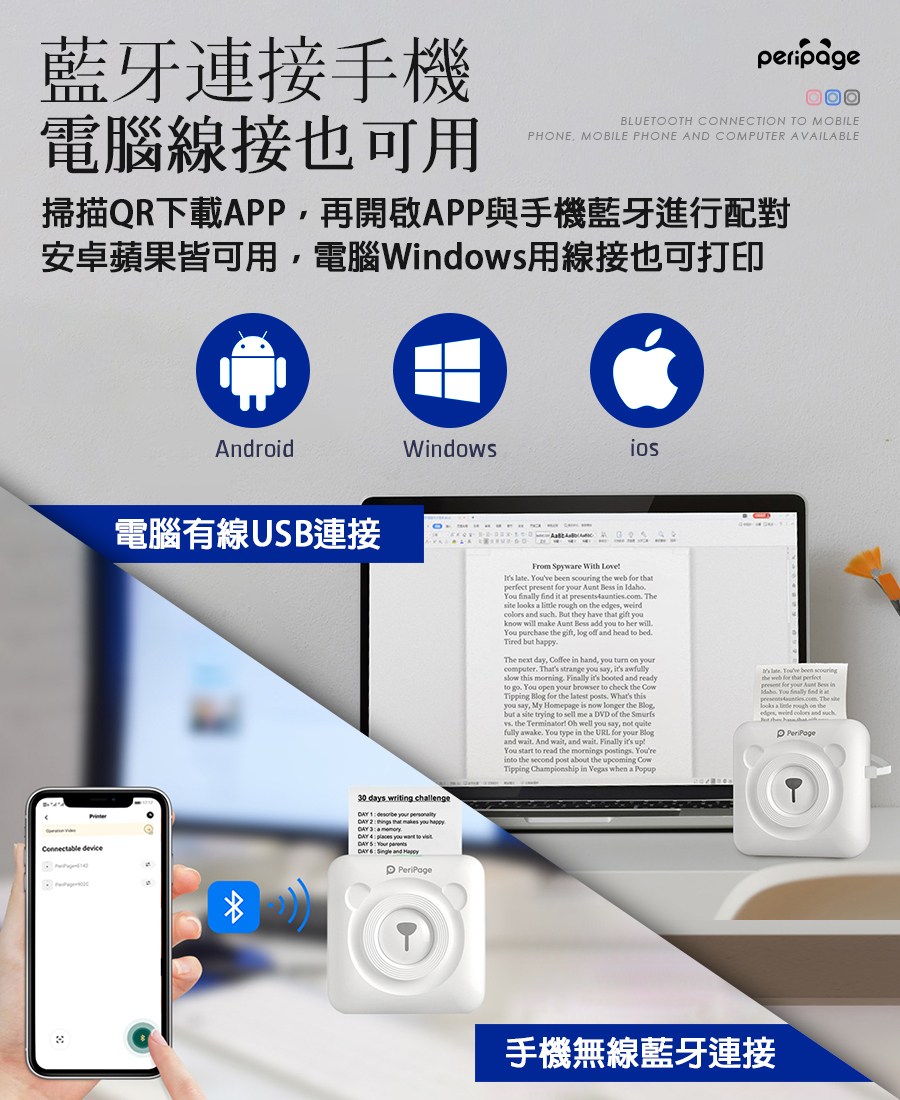 - 手機藍牙無線連接,擺脫繁瑣的線材束縛,隨時隨地輕鬆打印,操作簡單又方便。